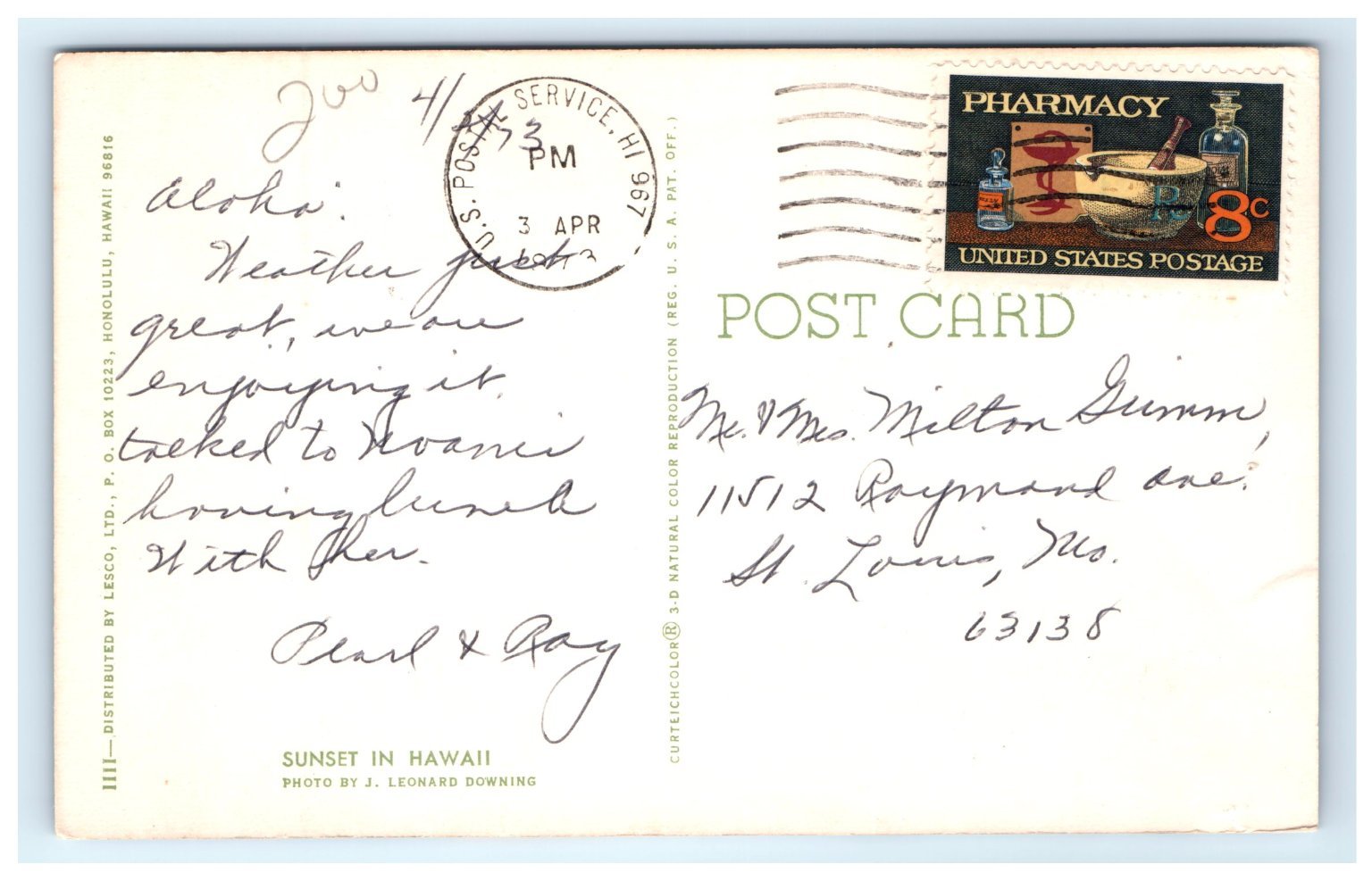 Distributed by Lesco Ltd. of Honolulu, Hawaii, this postcard dates from the mid-20th century, postmarked April 3, 1967, giving it historical significance as a souvenir from this iconic Pacific destination. The reverse side includes a handwritten message and an 8-cent "Pharmacy" United States postage stamp, reflecting authentic postal history. The card's standard 5.5 x 3.5 inch size makes it ideal for collectors or those interested in vintage travel memorabilia.