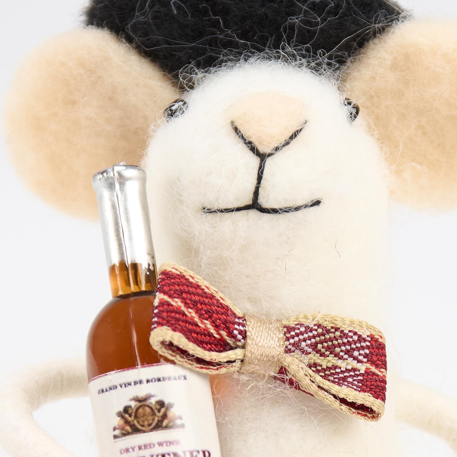 CUTE DETAILS: Mouse critter features cute handmade details including a fabric bowtie and plastic wine bottle in their arms