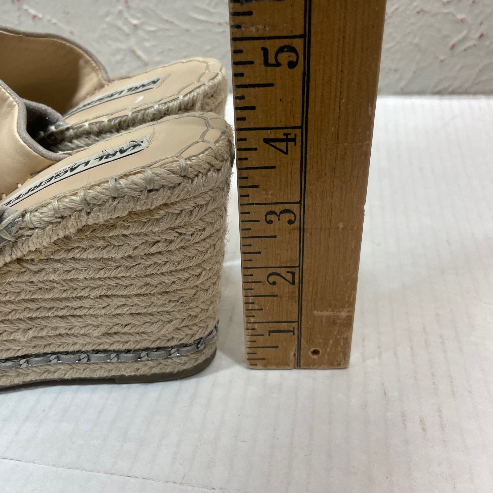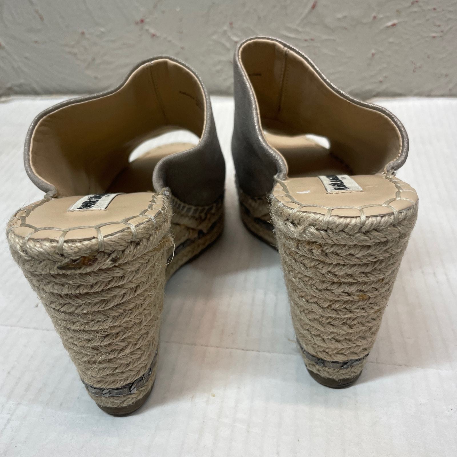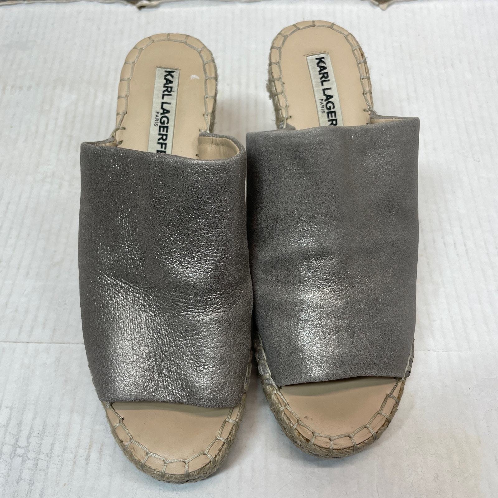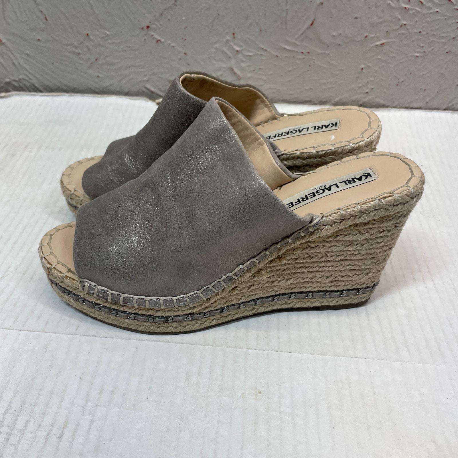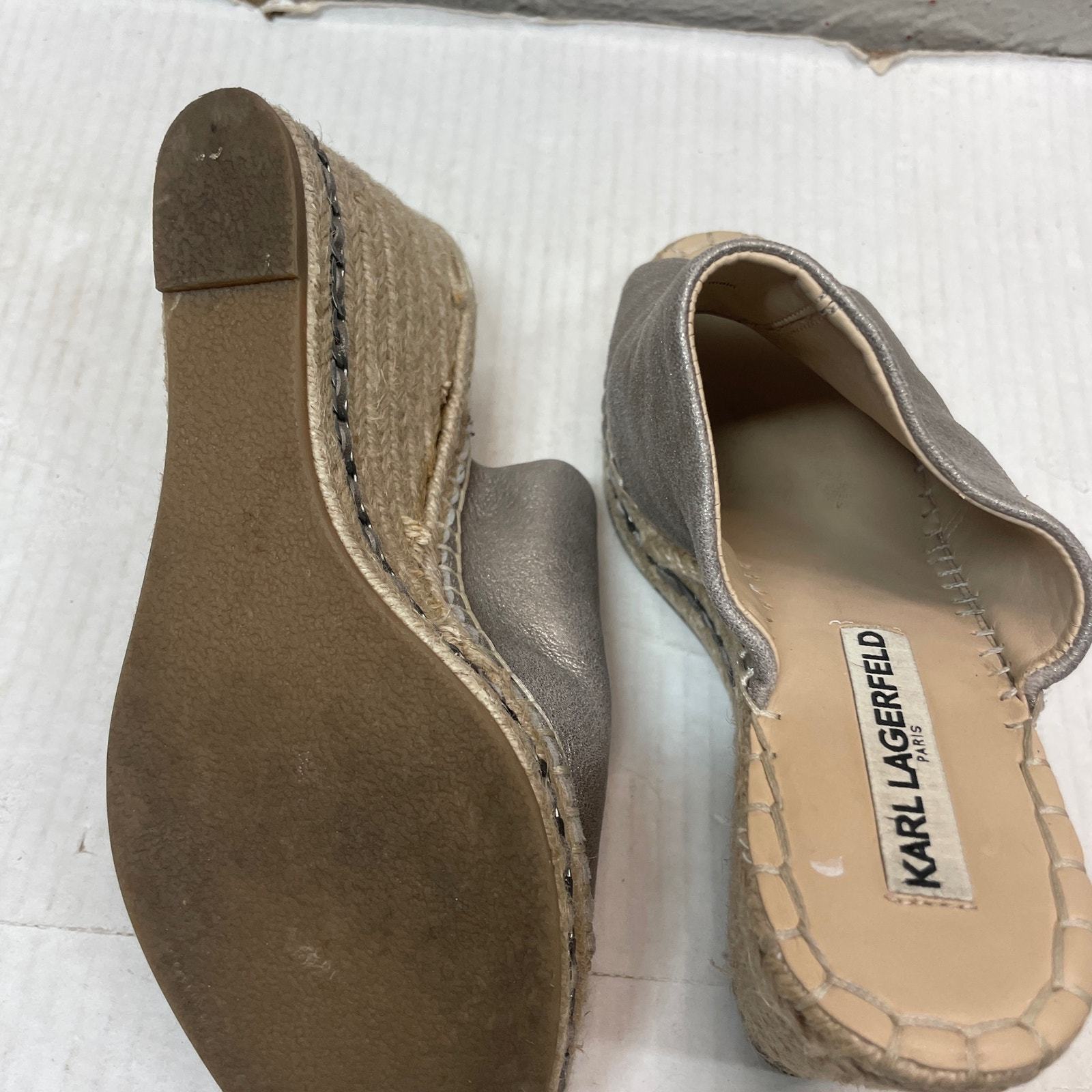 Karl Lagerfeld Paris Carina Silver Metallic Leather Wedge Heels Antique Size 7MThis item has been cleaned pers used clothing policy.