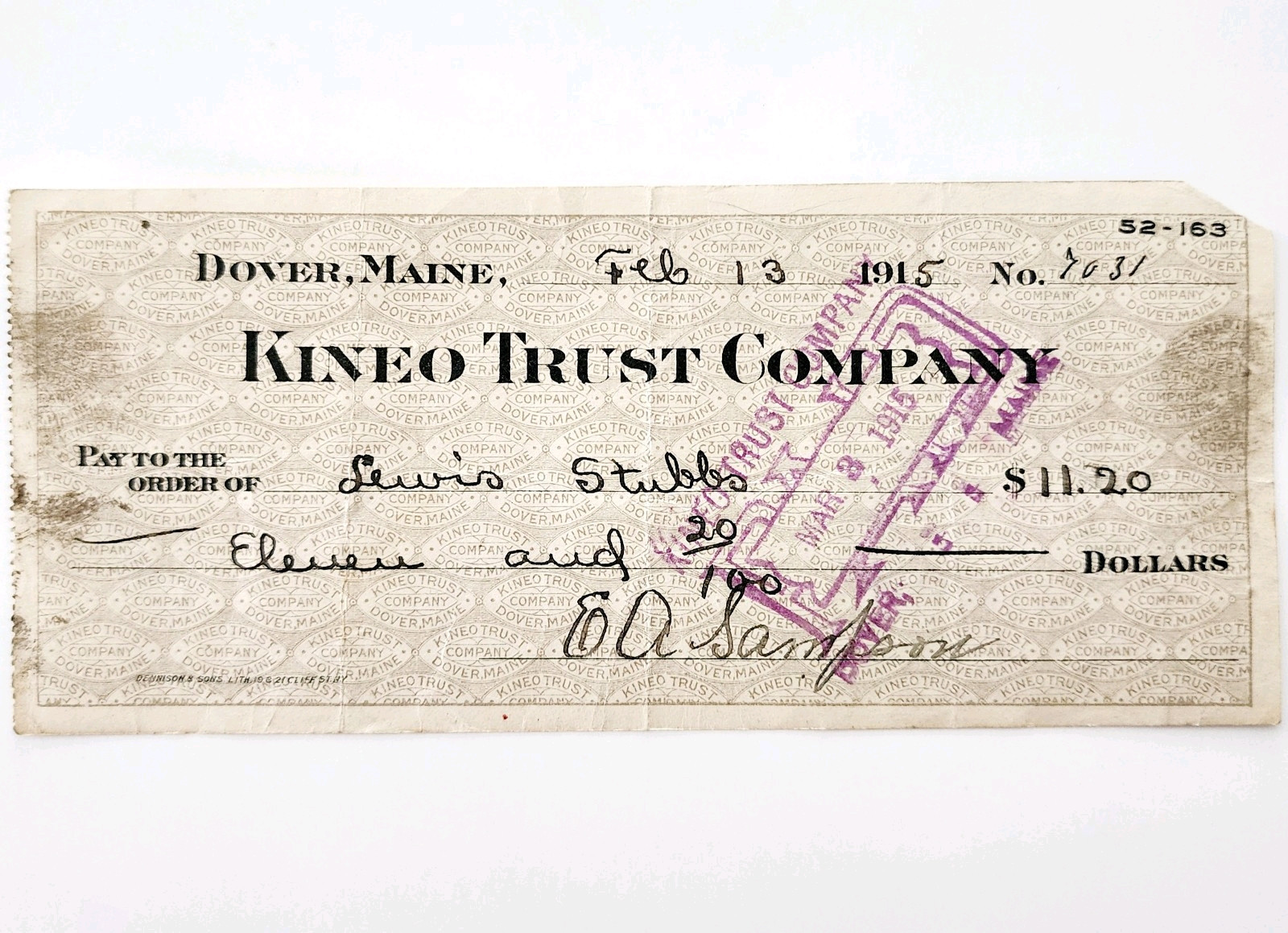 1915 Kineo Trust Company Bank Check E.A. Sampson Dover Maine Signed 7031 CHX13