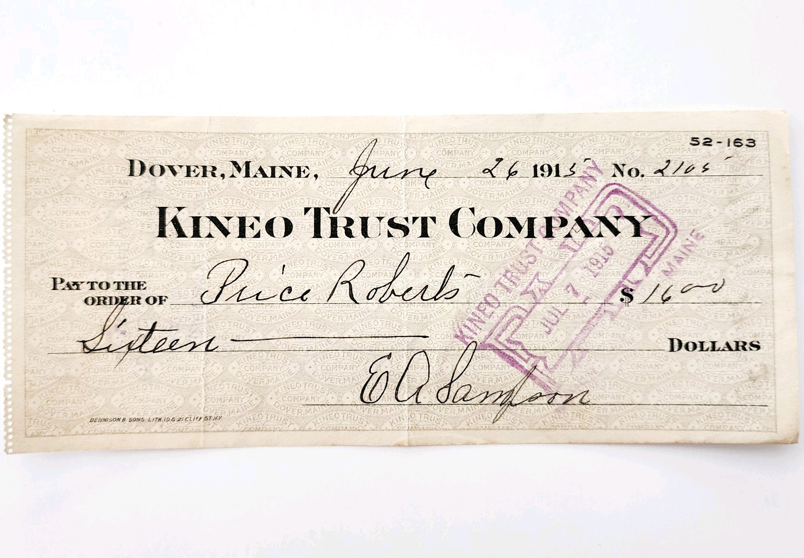 1915 Kineo Trust Company Bank Check E.A. Sampson Dover Maine Signed 2105 CHX13