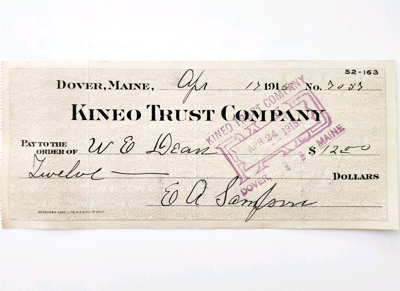 1915 Kineo Trust Company Bank Check E.A. Sampson Dover Maine Signed 7057 CHX15