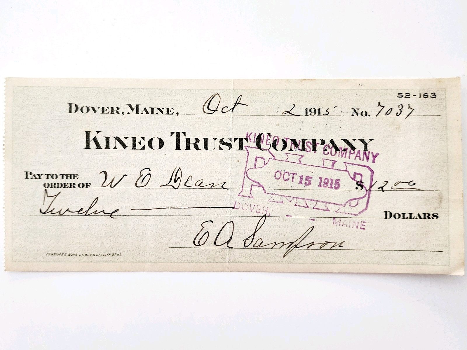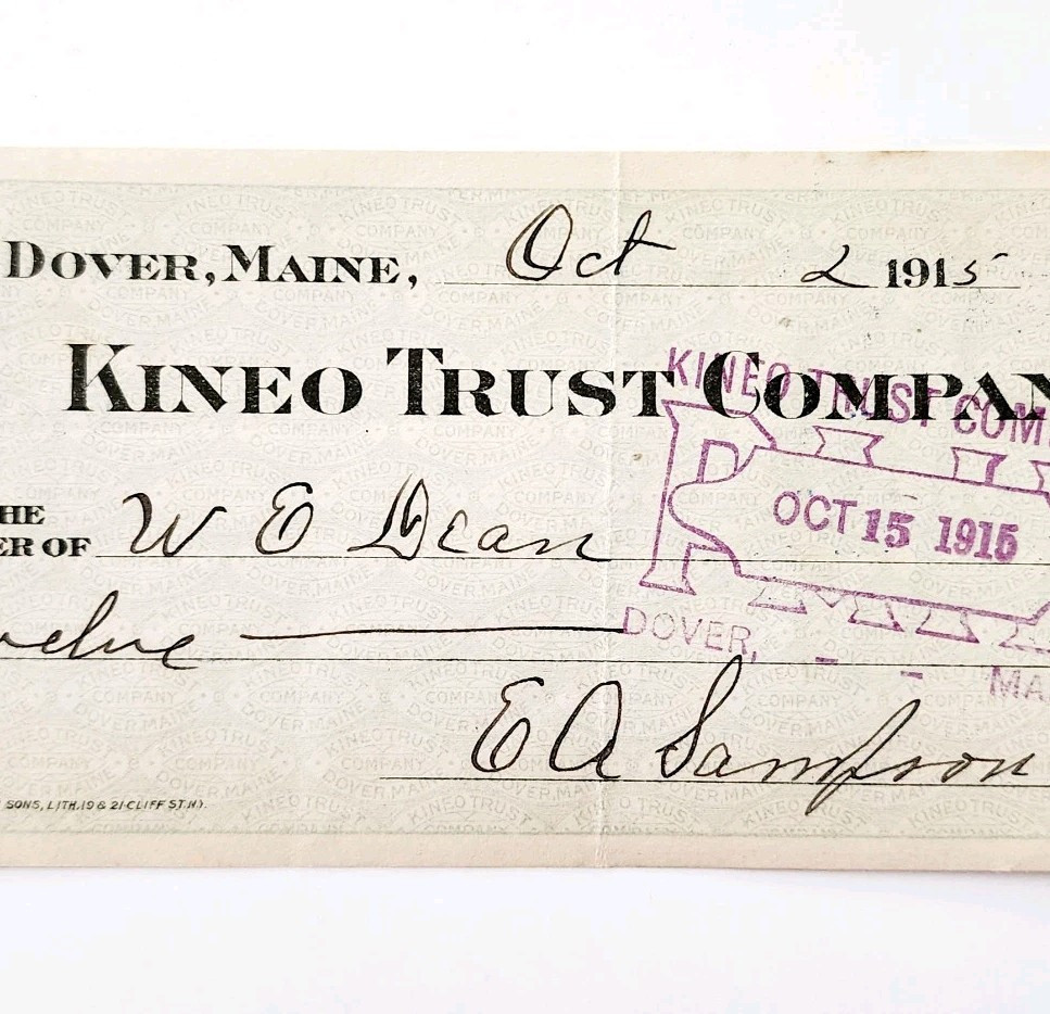 1915 Kineo Trust Company Bank Check E.A. Sampson Dover Maine Signed 7037 CHX14