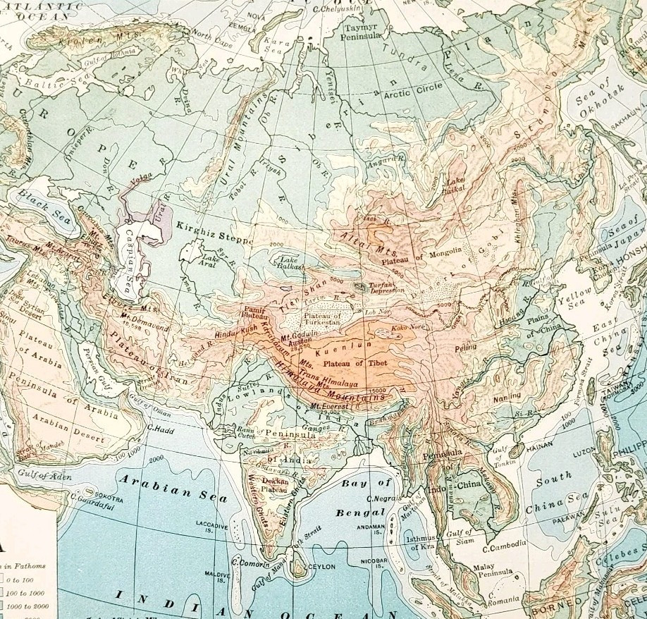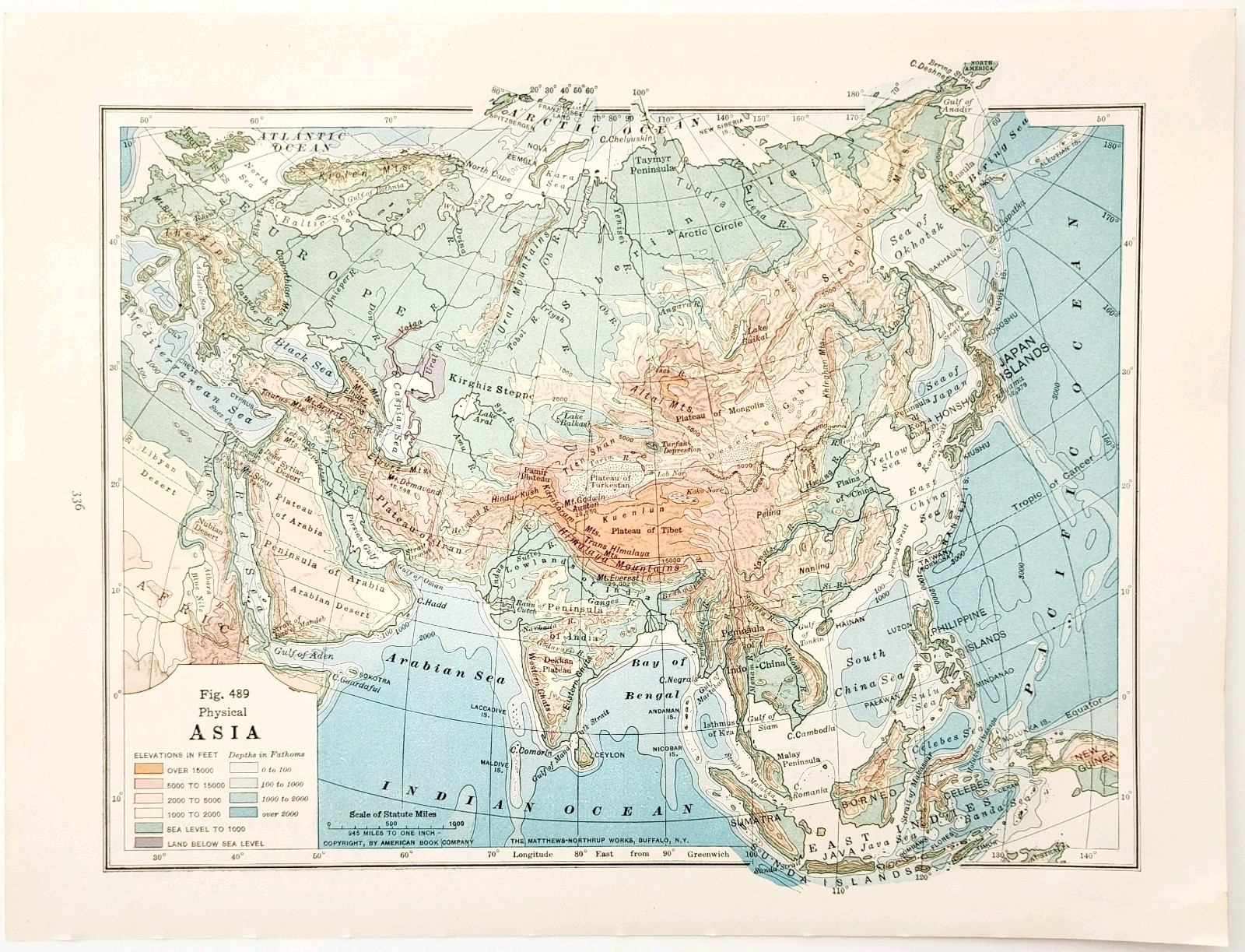 1916 Map Asia India Arabia Persia Iran Topography China Russia Physical DWSS9