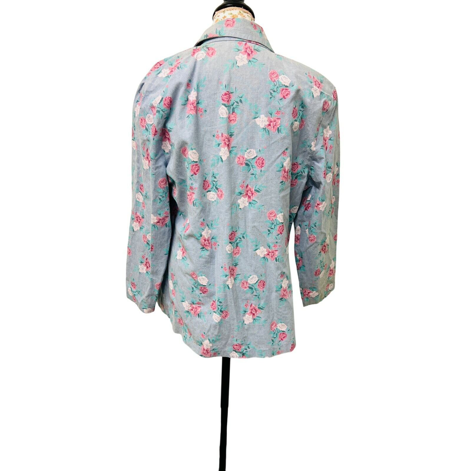 Charming Jessica Scott blazer in light blue with pink rose floral print. Classic 80s/90s vintage style with single-button closure and front pockets. Adds a pop of retro cottagecore flair to your wardrobe.