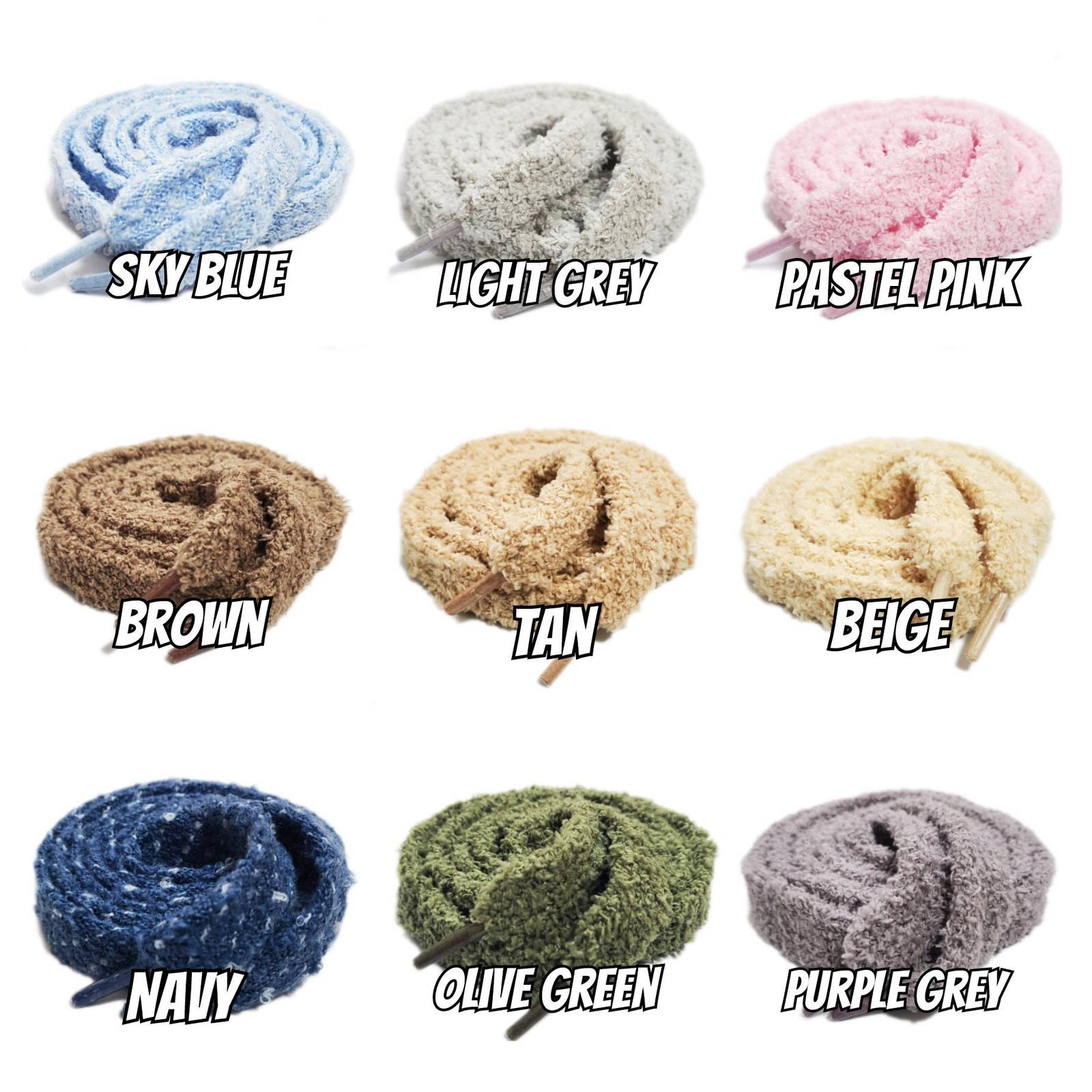 These wide, fuzzy, flat shoelaces come in 8 color options. The soft, plush texture enhances comfort, while the flat shape provides a secure, stylish fit. The versatile color selection allows for easy customization to match different shoe styles.