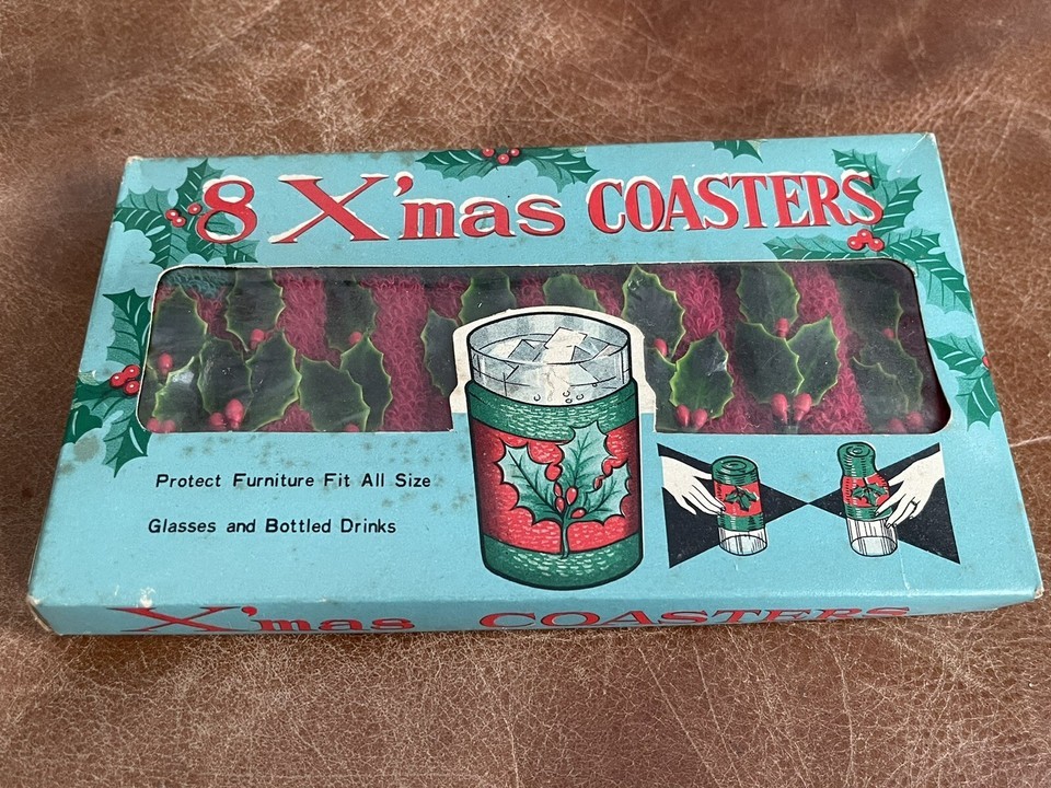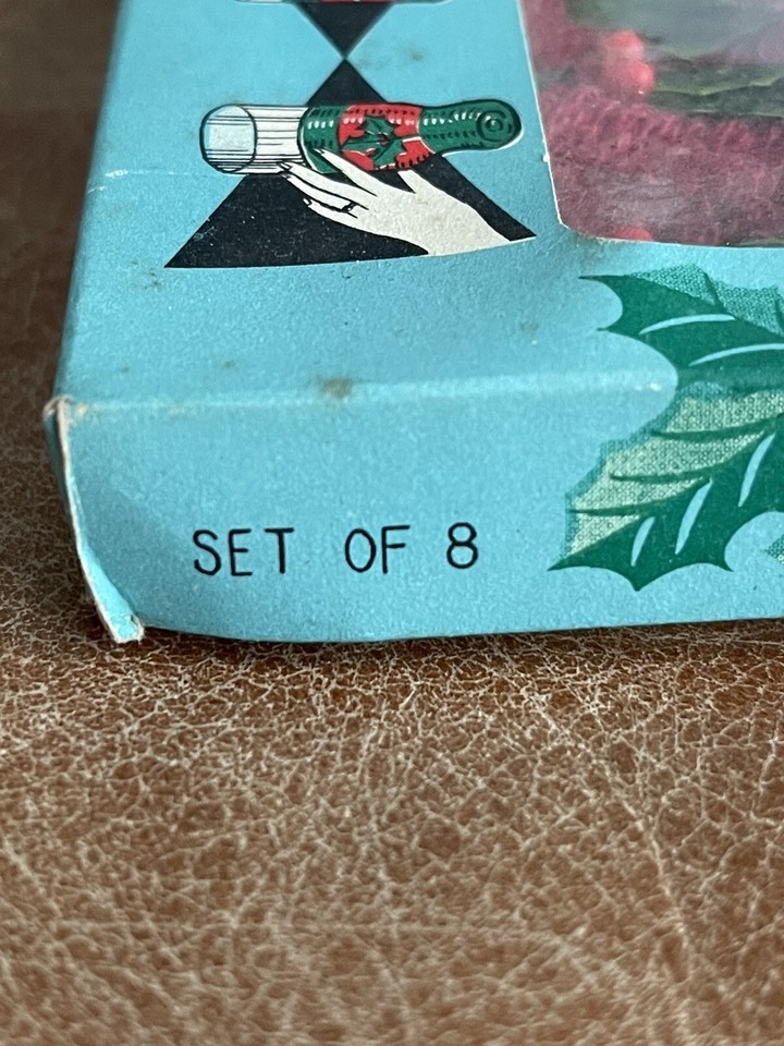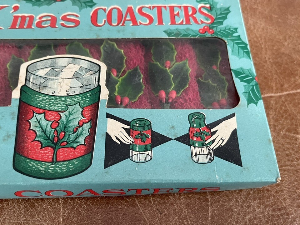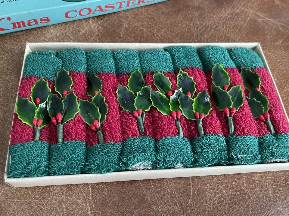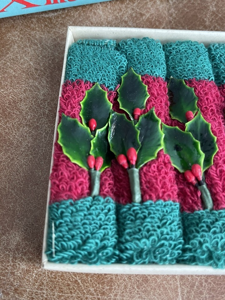 Christmas Koozies Set ELPO 3310 TERRY CLOTH COVER KNIT HOLLY Set Of 8 Vintage
