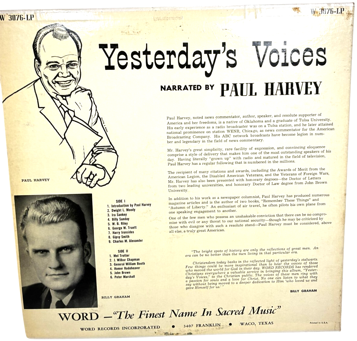 PAUL HARVEY - "YESTERDAY'S VOICES" - RECORD ALBUM LP - WORD W3076-LP