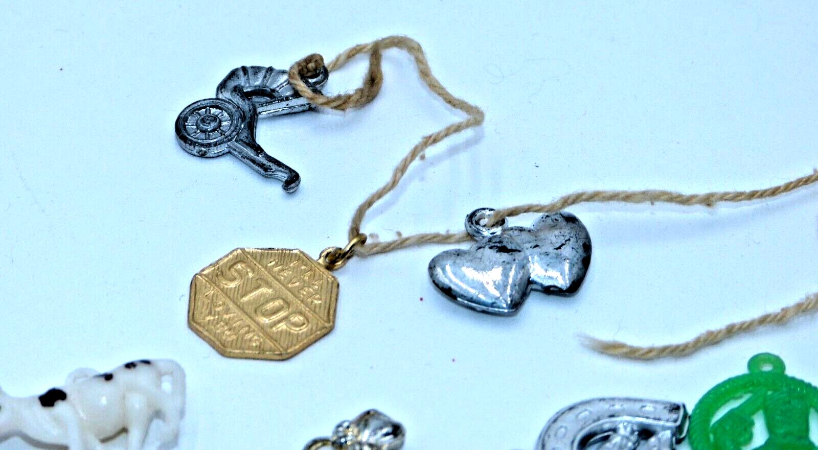 This is a collection of gumball machine prizes/charms, some signs of age and wear. Includes a little plastic green ring and a little plastic spring lock. Most are western themed, cow, six shooter and boot etc. Please look at all the pictures and email any questions