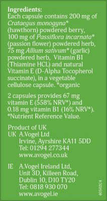 Each capsule contains 200mg of Crataegus monogyna* (hawthorn) powdered berry, 100mg of Passiflora incarnata* (passion flower) powdered herb, 75mg Allium sativum* (garlic) powdered herb, Vitamin B1 (Thiamine HCL) and natural Vitamin E (D-Alpha Tocopherol succinate), in a vegetable cellulose capsule.