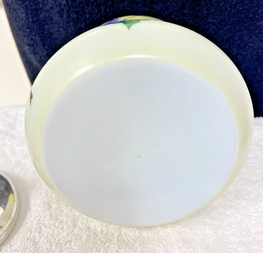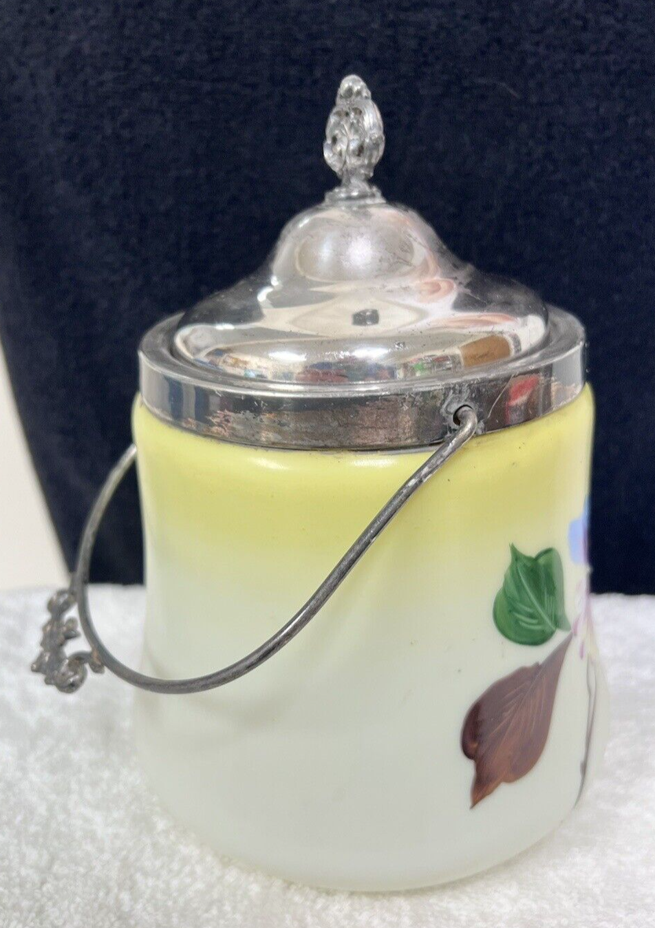 Victorian Hand Painted Milkglass Milk Glass Biscuits Jar Pansy w Metal Frame Lid