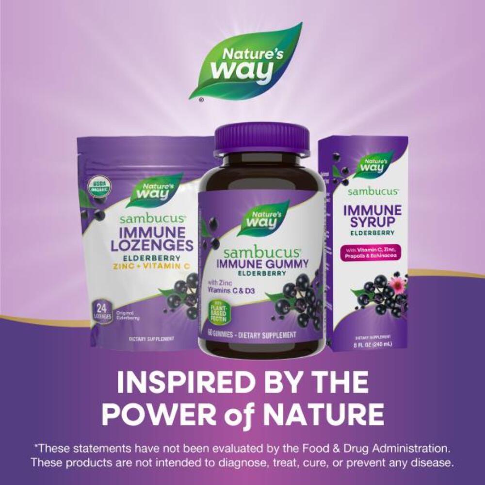 Expiration Date of 12/31/2026 ? Nature?s Way Sambucus Immune Gummies deliver 90 mg of vitamin C, 30 mcg (1,200 IU) of vitamin D3, and 7.5 mg of zinc per 2-gummy serving for daily immune support, plus premium, highly concentrated black elderberry extract* ? Elderberries contain naturally-occurring anthocyanins that provide antioxidant support to help neutralize free radicals* ? Adults and children ages 4+, chew 2 delicious berry-flavored gummies daily. A tasty, convenient way to support immune health all year long* ? Gluten-free and vegetarian elderberry gummies made with plant-based pectin?no gelatin, wheat, dairy, egg, peanut, or artificial colors ? Nature?s Way is pleased to share that Sambucus Immune Gummy and Sambucus Immune Gummy for kids were voted #1 Product of the Year.(1) ((1)Winner Immunity category. Survey of 40,000 people by Kantar.) Trust Nature?s Way for quality elderberry immune gummies