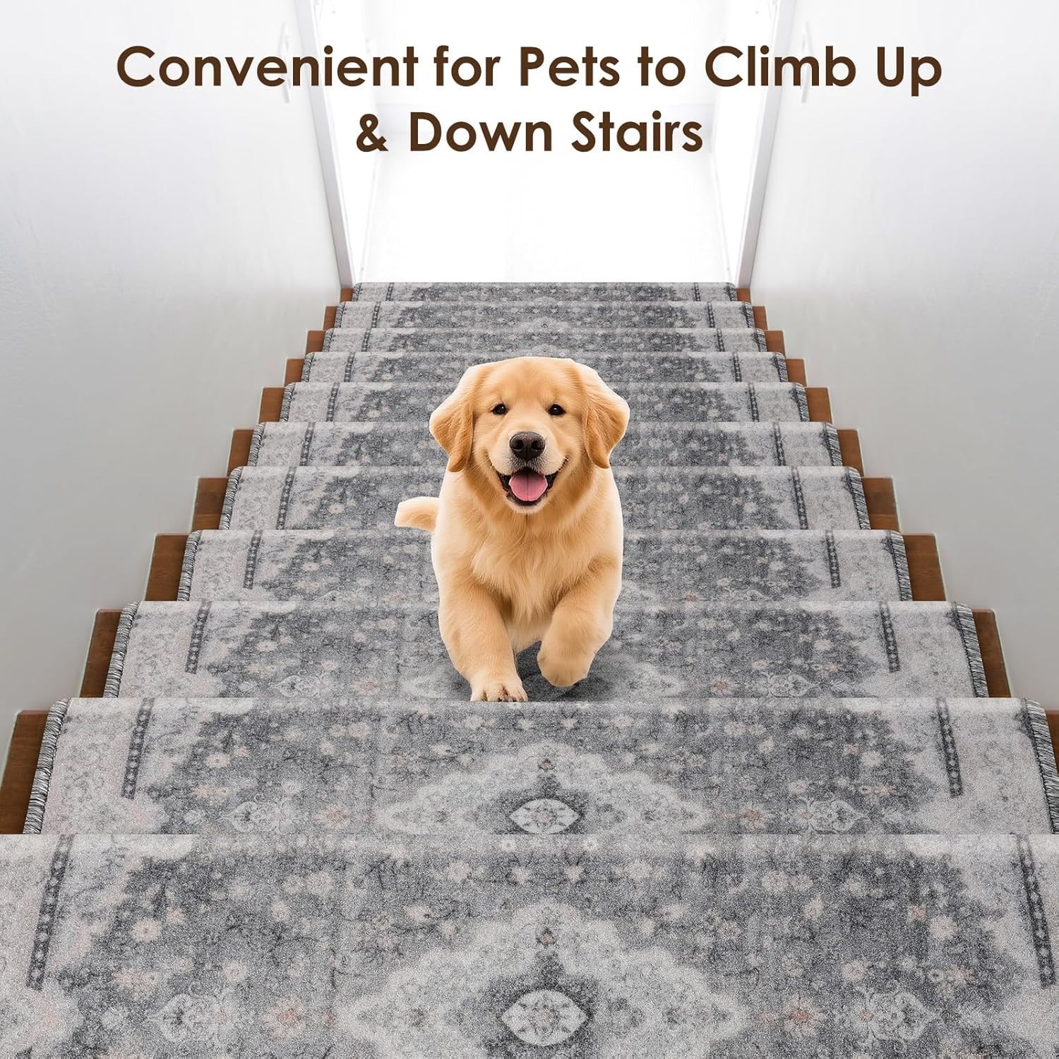 [Skin Friendly]: The boho patterned surface is soft and skin friendly for pets. The size of stair covers suitable for most homes. It is suitable for smooth marble steps, wood steps, brick steps and other hard and smooth stair surfaces to reduce the noise that generated by going up and down the stair