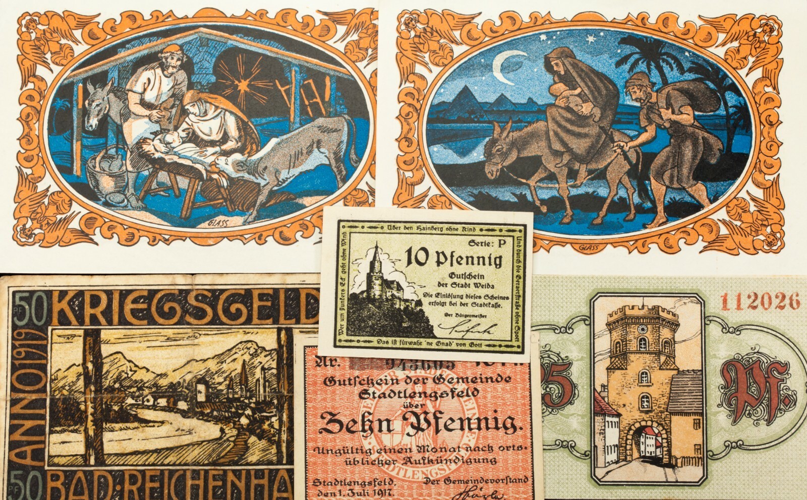 Este lote incluira 26 notas individuales de Notgeld de Alemania despues de la Primera Guerra Mundial. Todos estaran en la condicion no circulada (G-UNC). Valores de cara entre 5 pfennig a 5 marca.