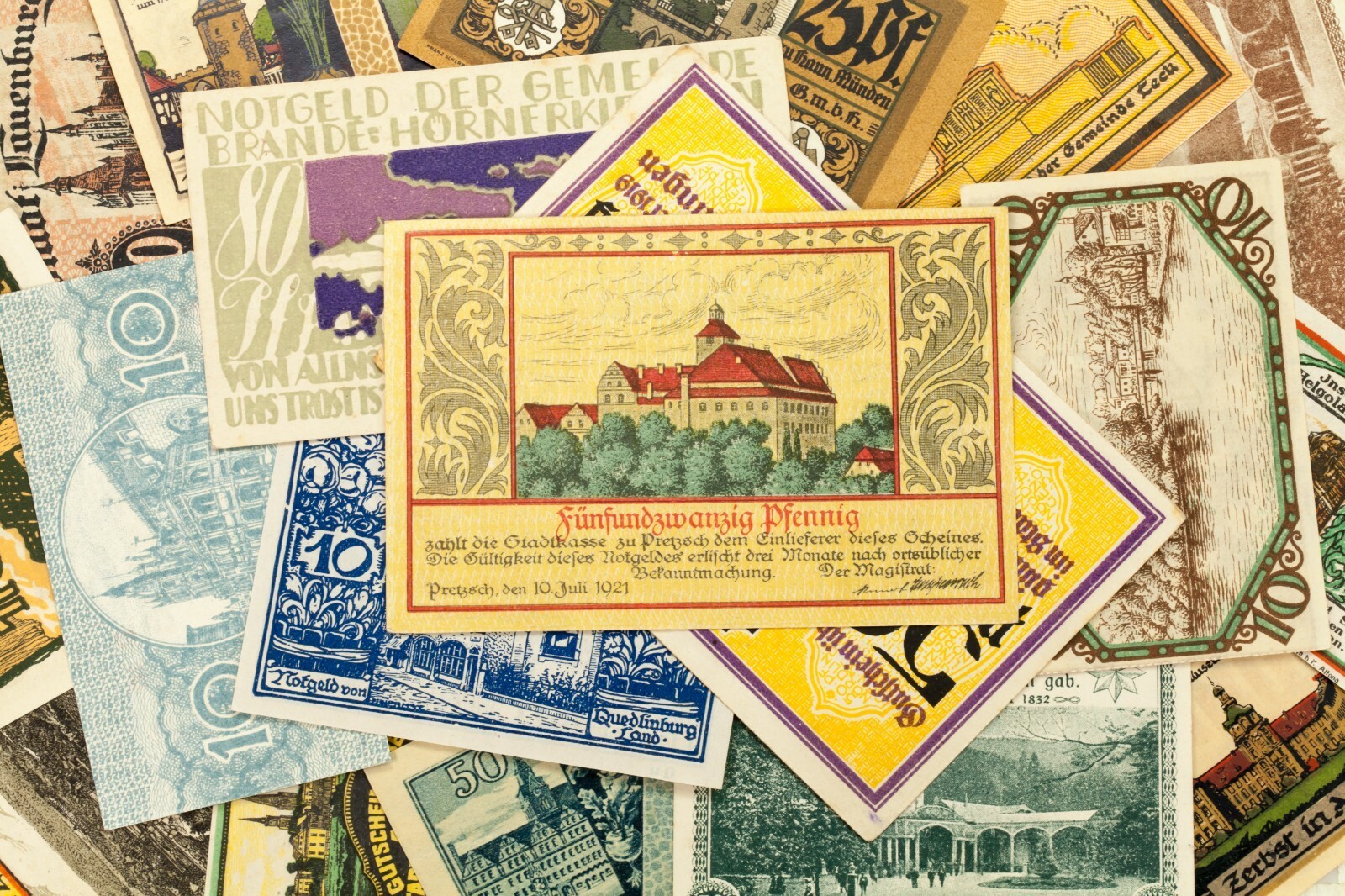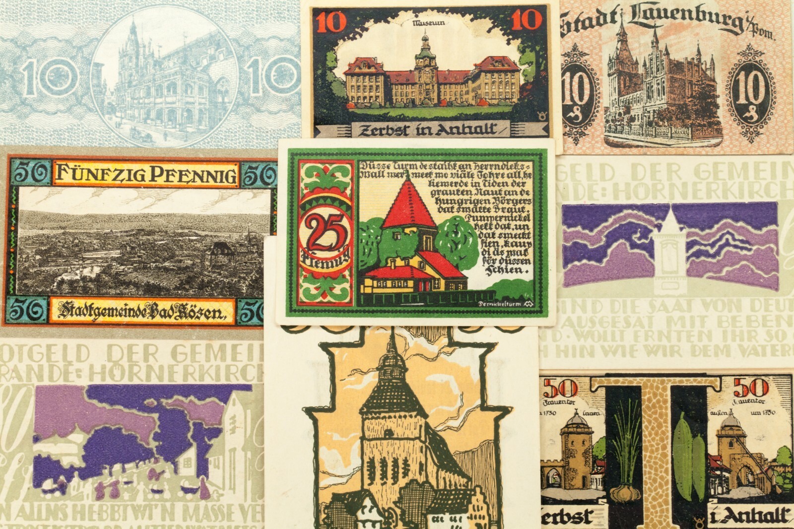 Este lote incluira 25 notas individuales de Notgeld de Alemania despues de la Primera Guerra Mundial. Todos estaran en la condicion muy fina a no circulada (VF-UNC). Valores de cara entre 5 pfennig a 5 marca. Tema de vistas a la ciudad; Monumentos de referencia, edificios famosos y paisajes. No hay duplicados.