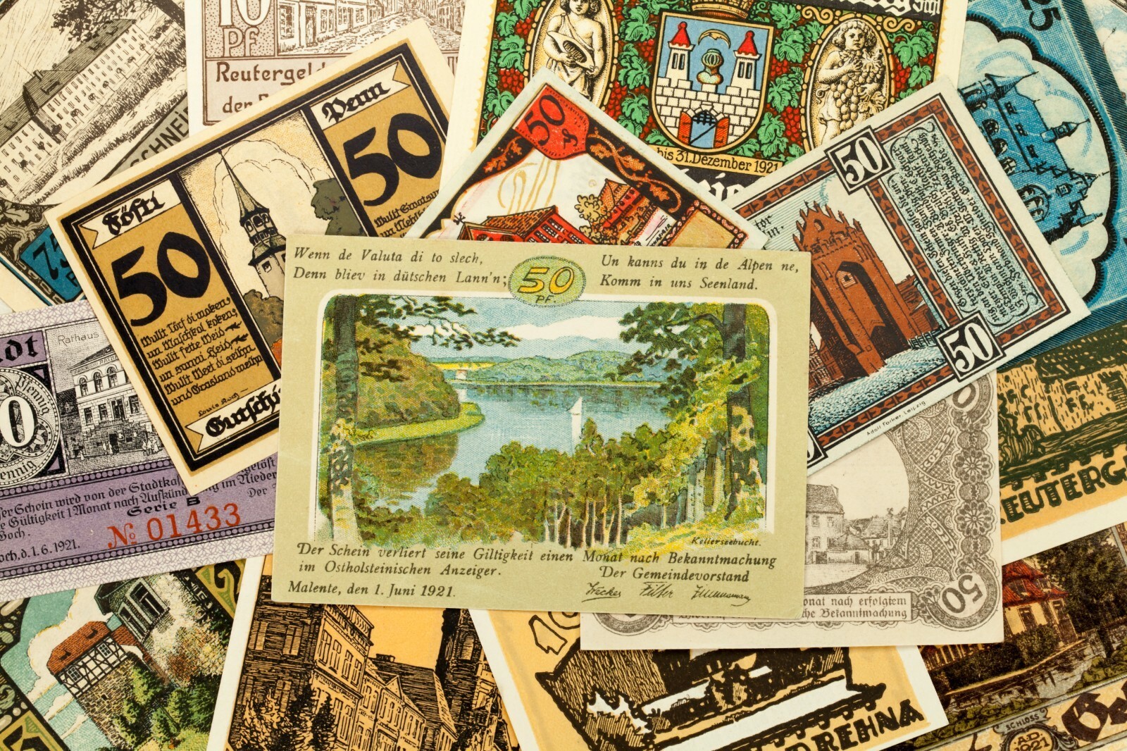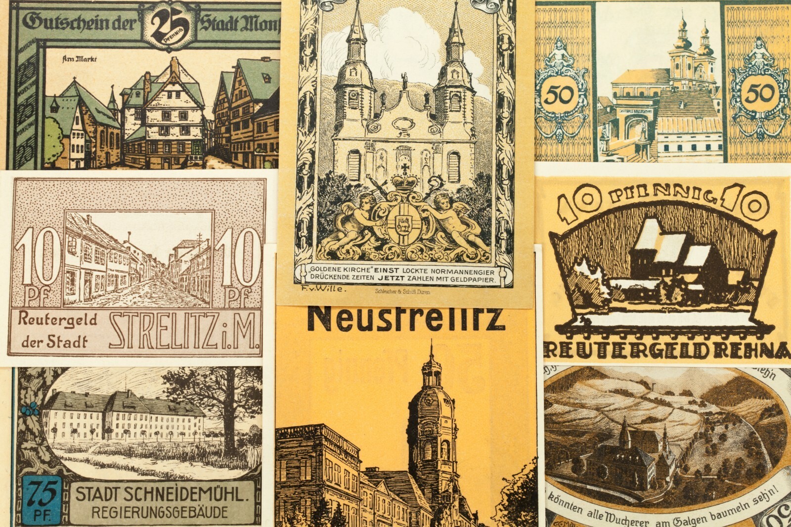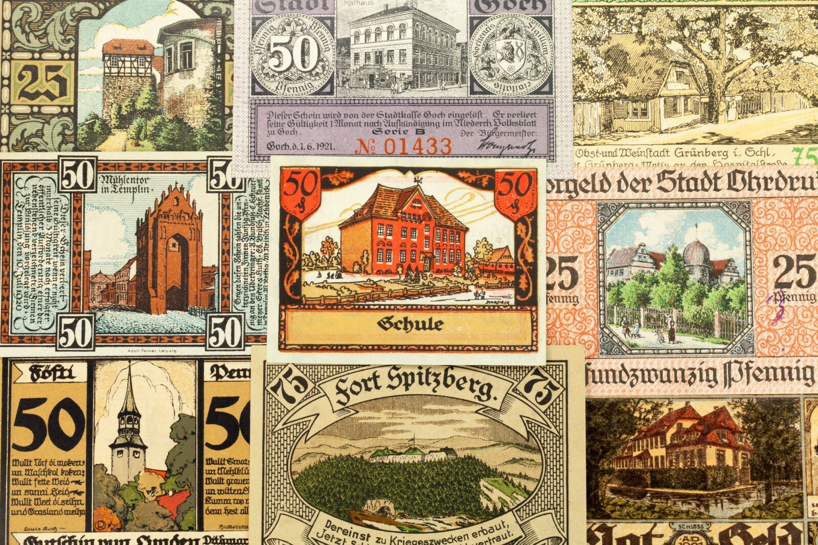 Este lote incluira 25 notas individuales de Notgeld de Alemania despues de la Primera Guerra Mundial. Todos estaran casi sin circular a la condicion no circulada (AU-UNC). Valores de cara entre 5 pfennig a 5 marca. Tema de vistas a la ciudad; Monumentos de referencia, edificios famosos y paisajes. No hay duplicados.
