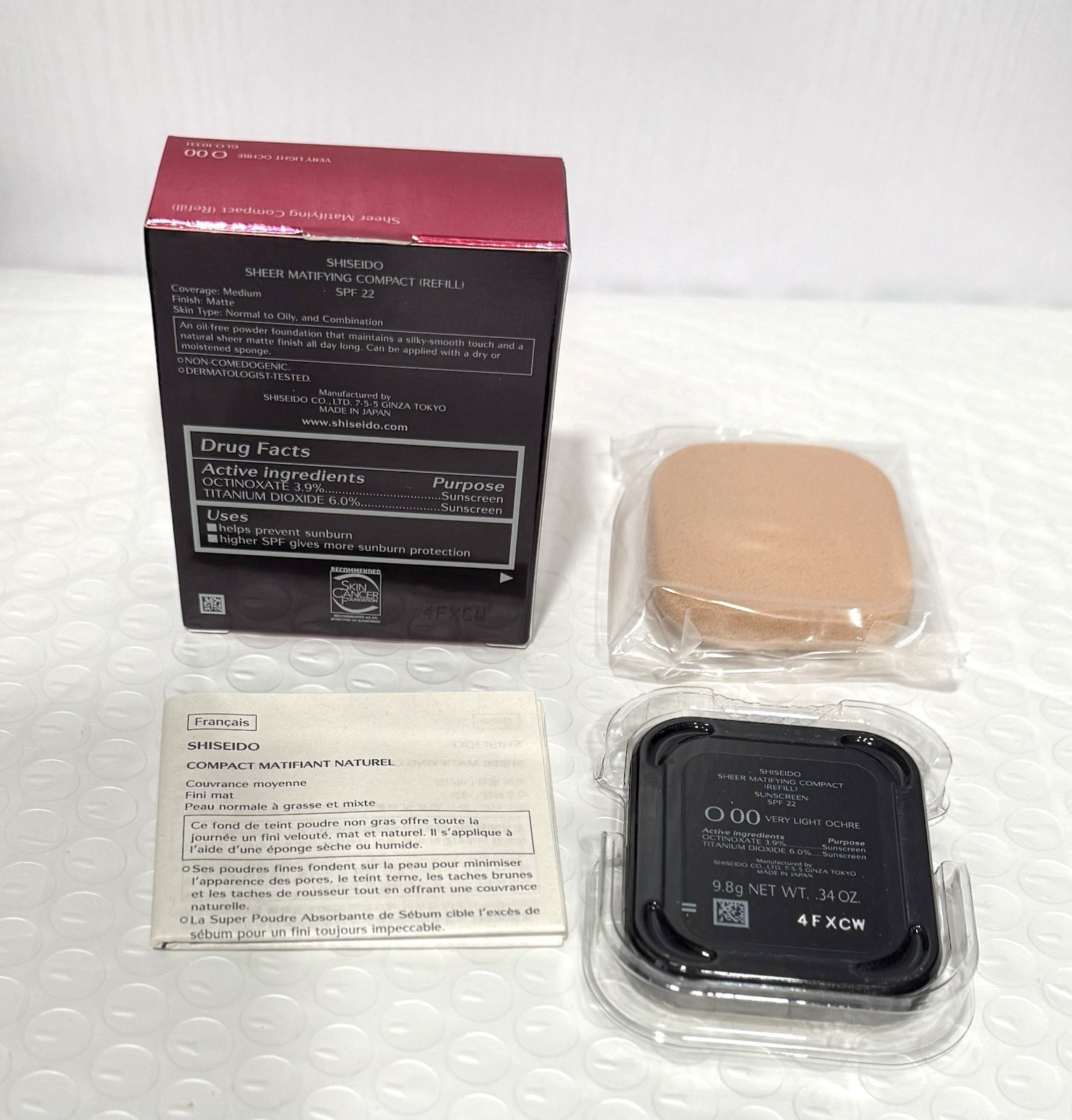 You will get a brand new in box Shiseido Sheer Matifying Compact SPF 22 Refill Very Light Ochre O00 NIB as shown in the pictures.