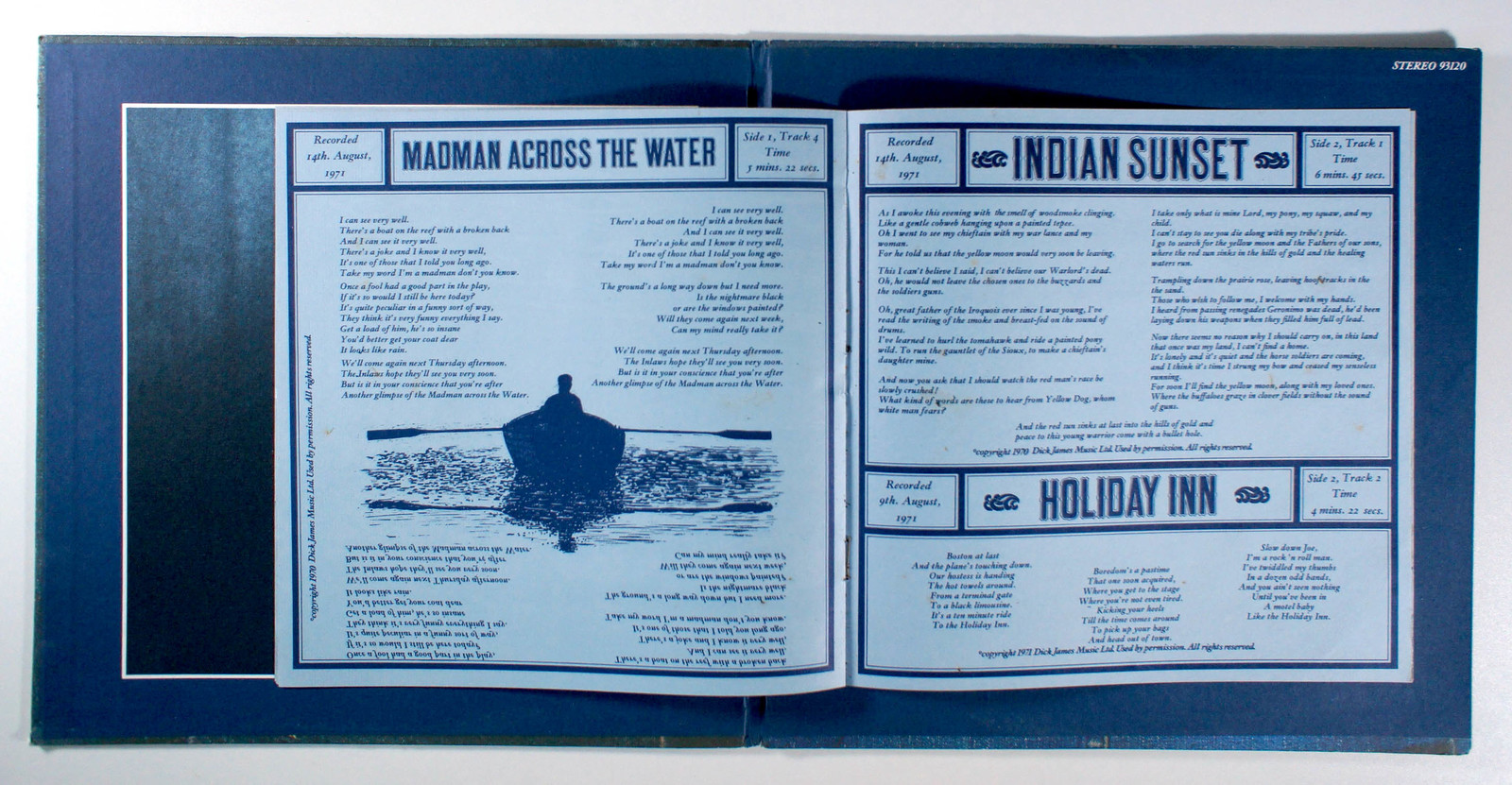 Madman Across the Water by Elton John, reached No. 8 in early 1972 on the Billboard 200, and was certified 2 platinum by 1998. The title song was set to be released on John's previous album Tumbleweed Connection. However, it was set aside and would eventually be re-recorded for this album. When it was released in 'The Classic Years' collection, Madman Across the Water was the first album not to feature any bonus tracks. This was John's first album in which he plays his piano and no other keyboards. This was the first album in which Davey Johnstone played guitar for John, a role that would continue for decades to come. As with all John songs during this period, the lyrics were penned by his writing partner, Bernie Taupin. This was the last album to be recorded at London's Trident Studios. They relocated to Chateau d'Herouville for the next three albums. Original copies of Madman Across the Water come with a gate-fold cover; housed inside is a 6 page photo booklet glued to the inner right panel. The cover of the original release also has a soft feeling like denim to it.