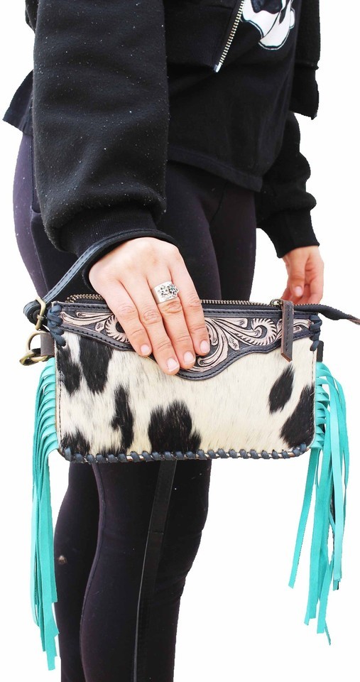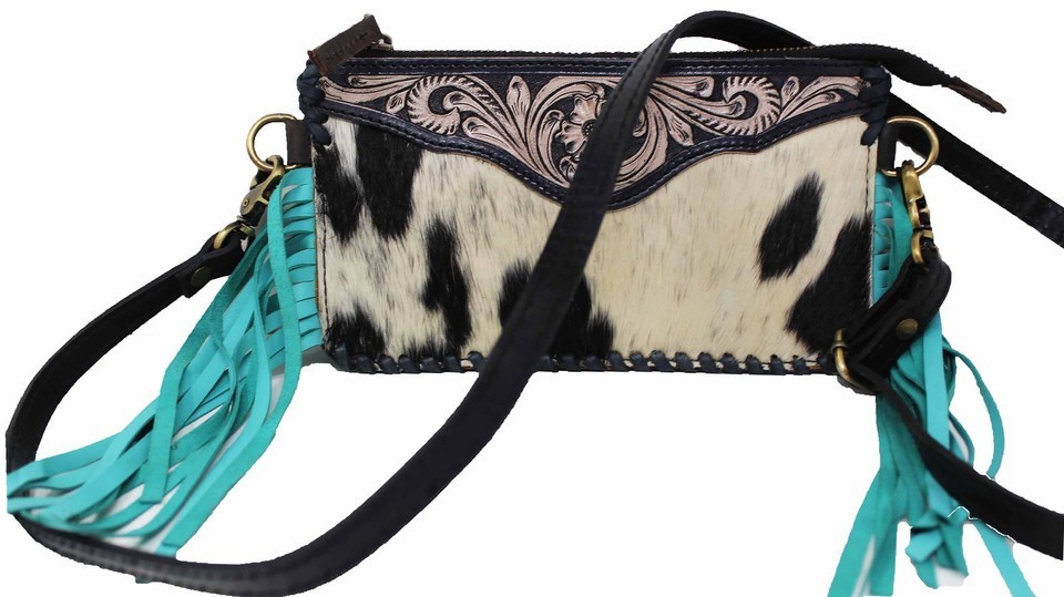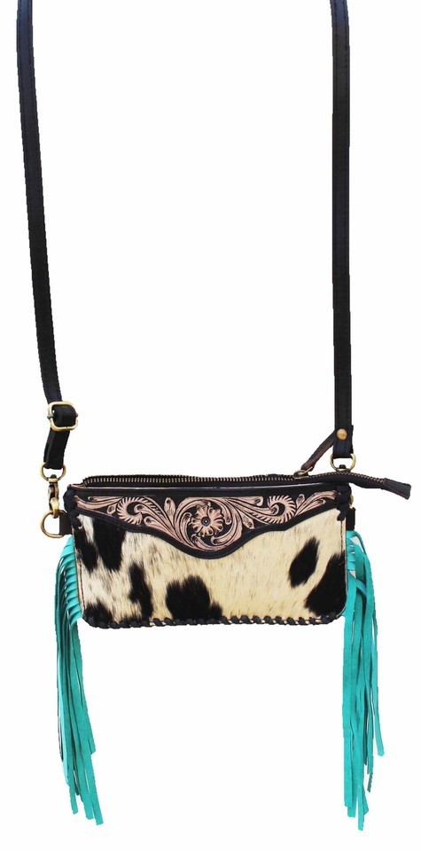 Challenger women's western small crossbody purse made from supple genuine full-grain leather to endure everyday use. Bag comes accented with cowhide front, floral tooled leather inlay, laced bottom, and turquoise side fringe. Includes a removable adjustable shoulder strap. Full zippered main compartment comes fully lined with durable tan canvas and has a side zippered pocket. Backside of bag is made of distressed brown leather. The antique finish brass hardware beautifully ties the bag together. Cowhide is a natural product, each bag may vary slightly in shading, or color making each item a unique product.? Bag measures 8-1/2" L x 5" H.