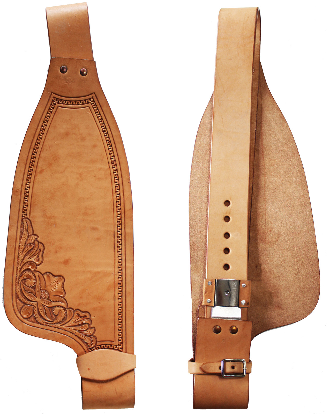 Challenger replacement saddle fenders made of genuine full grain leather. Uniquely accented with hand-tooled floral design on dark brown leather. Fenders come complete with belvins buckles and hobble straps. Adult size, each measure 16-1/2" long x 7-3/8" wide.