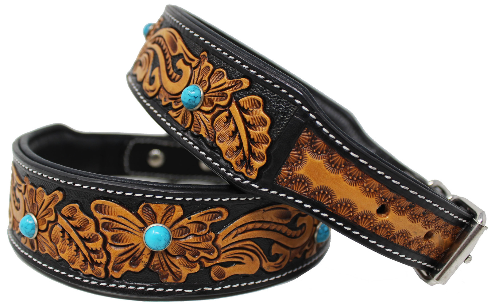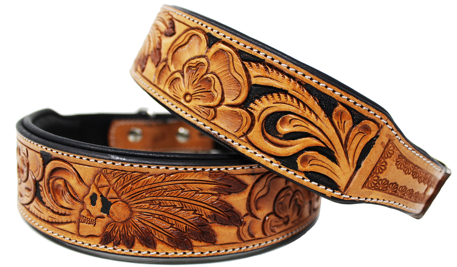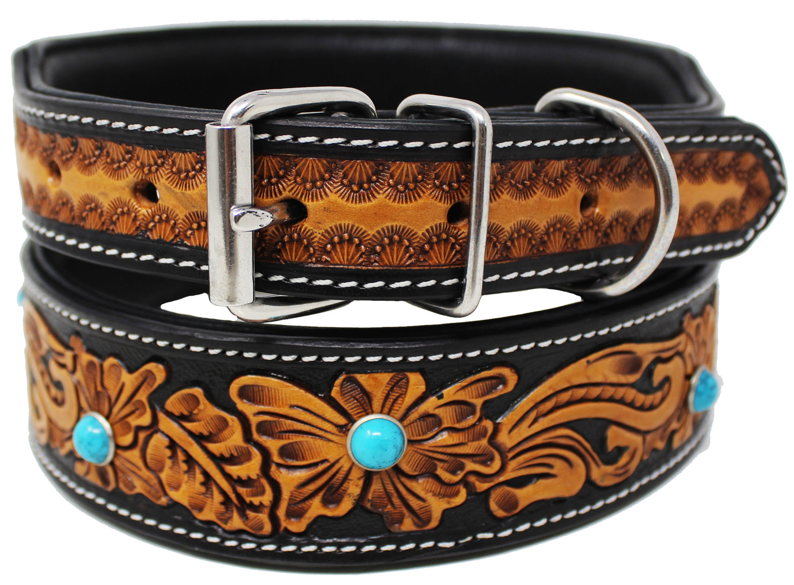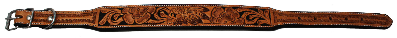 Challenger genuine handmade full grain leather heavy-duty dog collar comes fully padded for comfort. Collar is accented with a hand-tooled floral inlay. Rust-free stainless steel hardware.