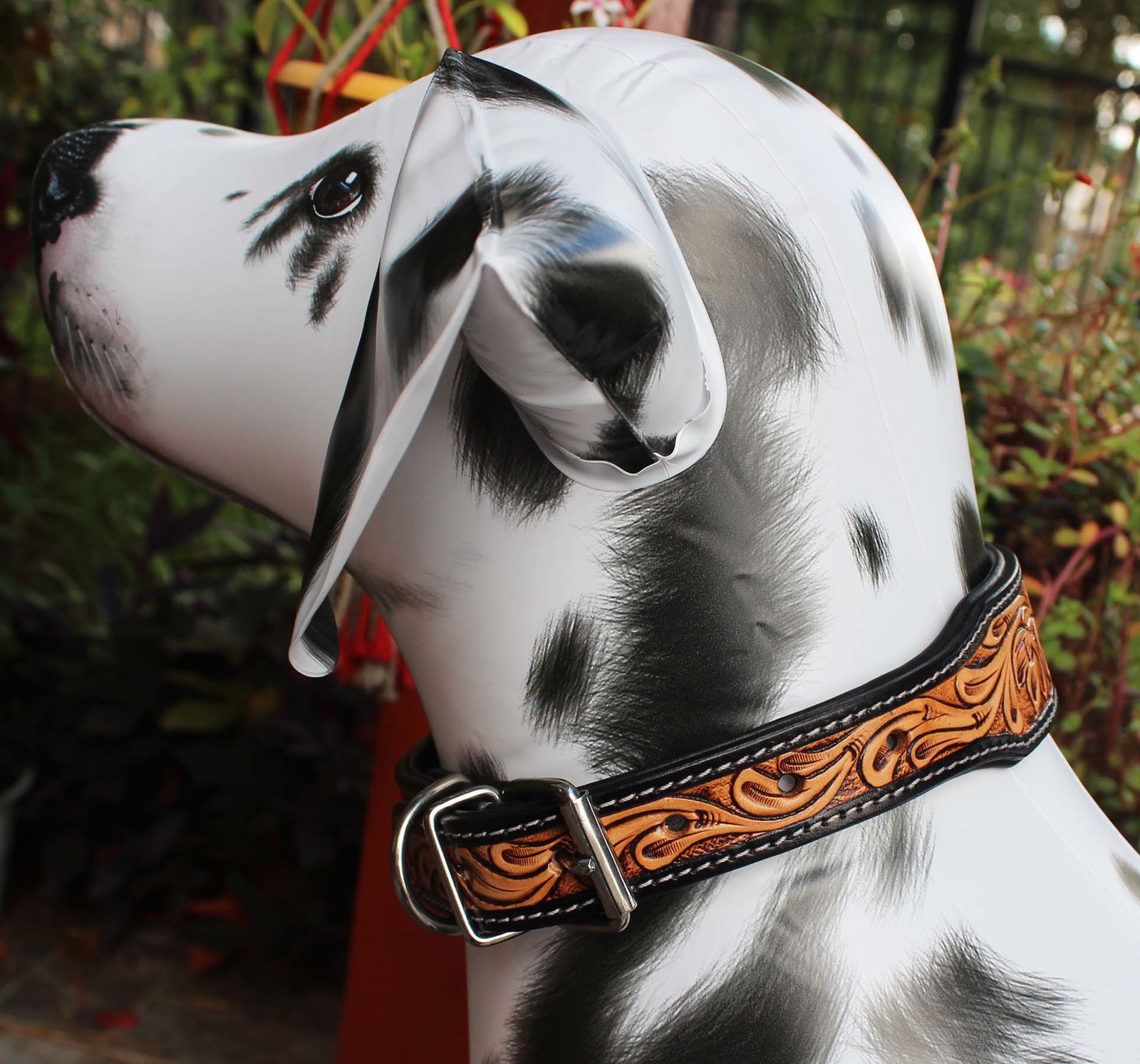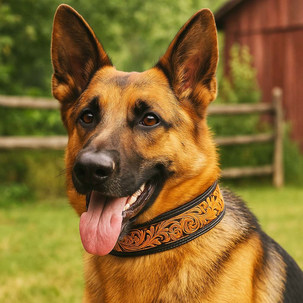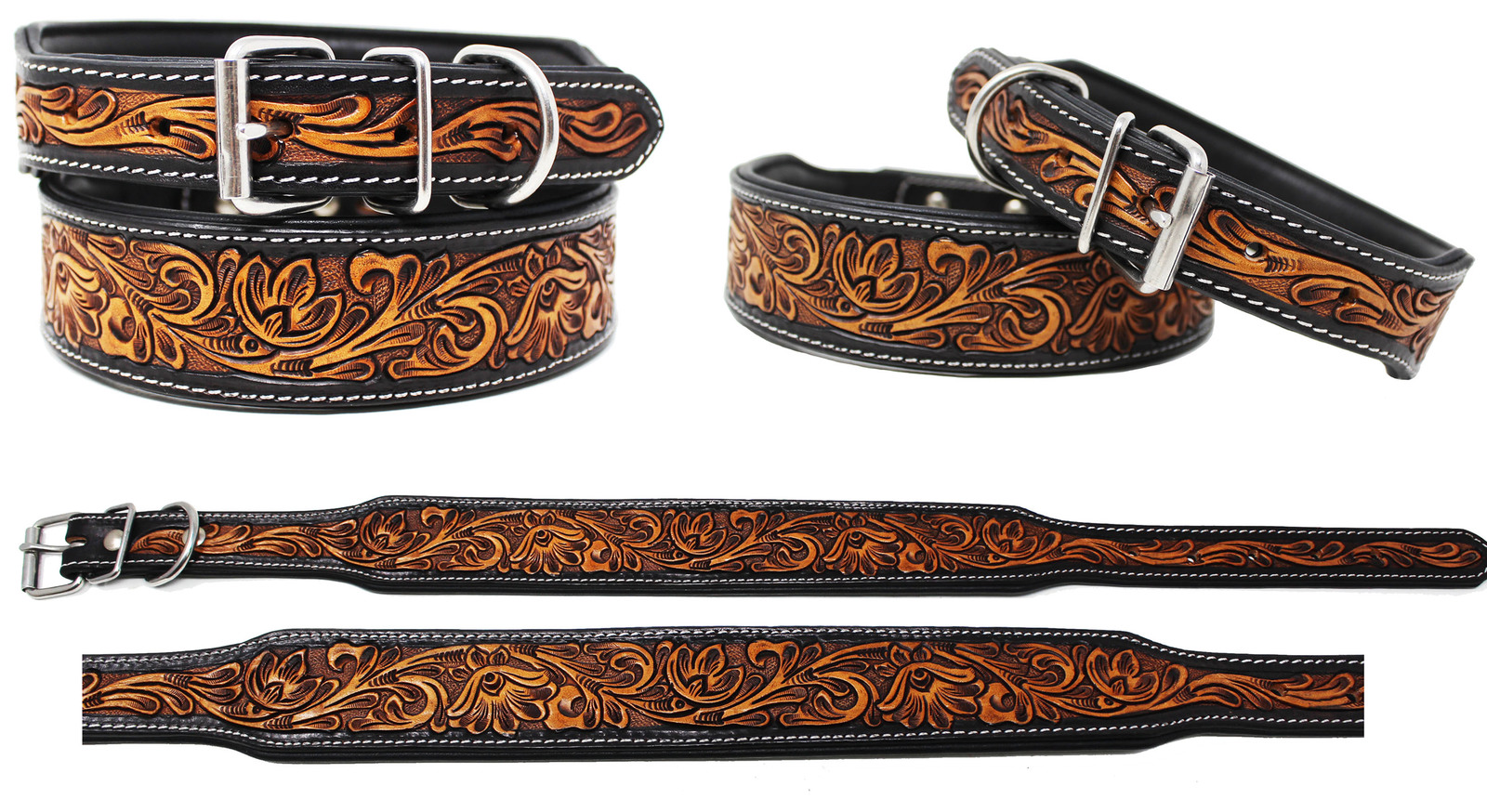 Challenger genuine handmade full grain leather heavy-duty dog collar comes fully padded for comfort. Collar is accented with a hand-tooled floral inlay. Rust-free stainless steel hardware.