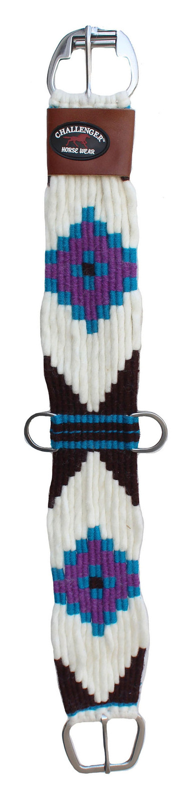 Challenger multicolored 13-strand western straight cinch made of a mohair wool blend. All-natural fibers are soft, strong and have natural elasticity, allowing your horse to breathe easily. Heavy-duty stainless steel hardware are both long lasting and rust free. Roller buckle helps make cinching easier.