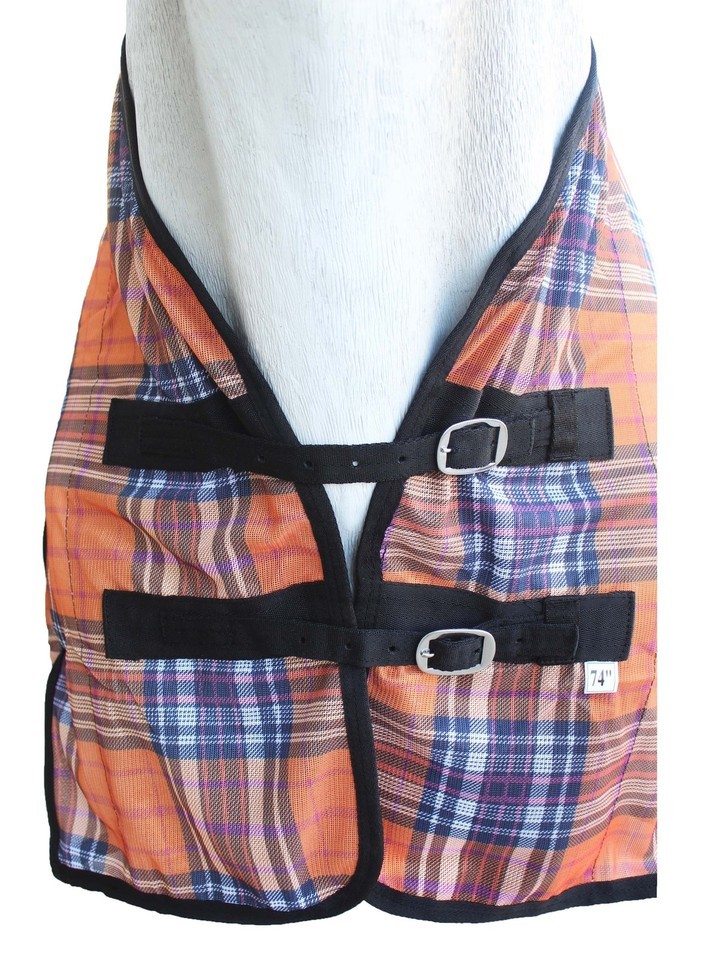 Fly sheet made from soft poly nylon mesh which allows for air circulation. Dual front buckle closure, adjustable surcingles, and elastic leg straps help secure sheet in place. Tail cover offers added protection. Shoulder gusset offers freedom of movement.