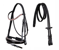 Challenger All-Purpose English bridle crafted from vegetable-tanned black leather that is durable yet supple. Bridle comes accented with a eye-catching browband with a multiple rows of crystals, and a glossy black finish noseband. The perfect choice for training, or everyday use. Soft leather padded cushioning provides comfort. Features non-rust stainless steel hardware. Comes complete with a removable flash, nylon webbed reins for grip with leather stops, and buckle bit ends.