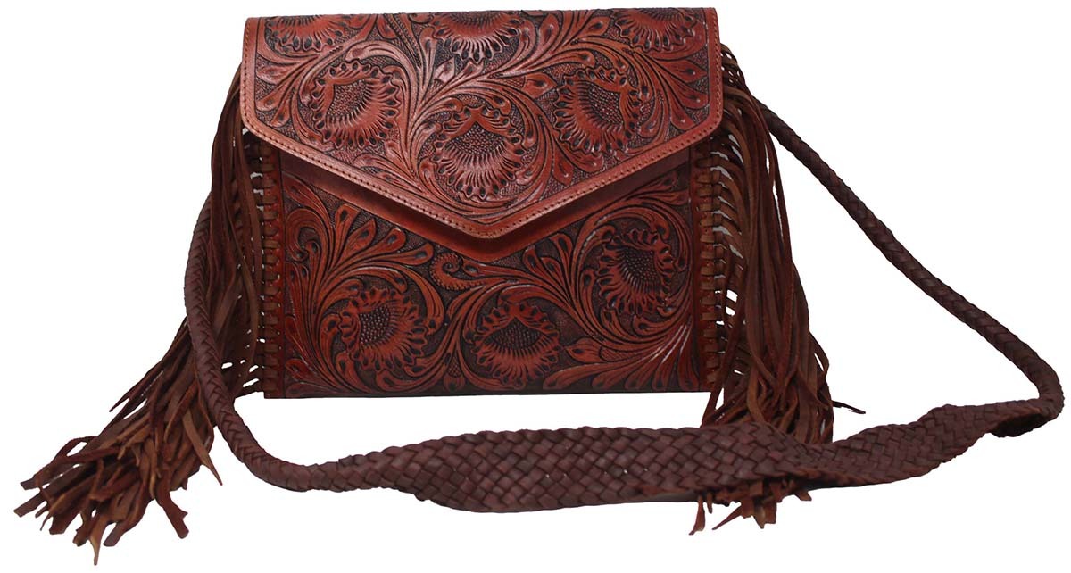 Challenger women's western versatile shoulder bag made from genuine full-grain mahogany leather to endure everyday use. Handbag comes accented with a deep hand-tooled floral design front, and laced side fringe. Includes a soft braided rolled removable shoulder strap. Button closure main pocket comes fully lined with tan canvas. Interior features one side zippered pocket, and two open compartments for organized storage. Bag measures 11-3/4" L x 9-3/4" H providing plenty of room for all of your daily essentials.