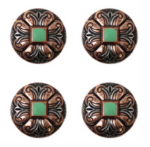 Set of 4 screw back conchos. Accented with two-tone engraving and a teal stone center. Measures 1 1/4" (32 mm) in diameter. Easy to install with chicago screws included. Beautifully accents any tack, saddle, belt, etc.