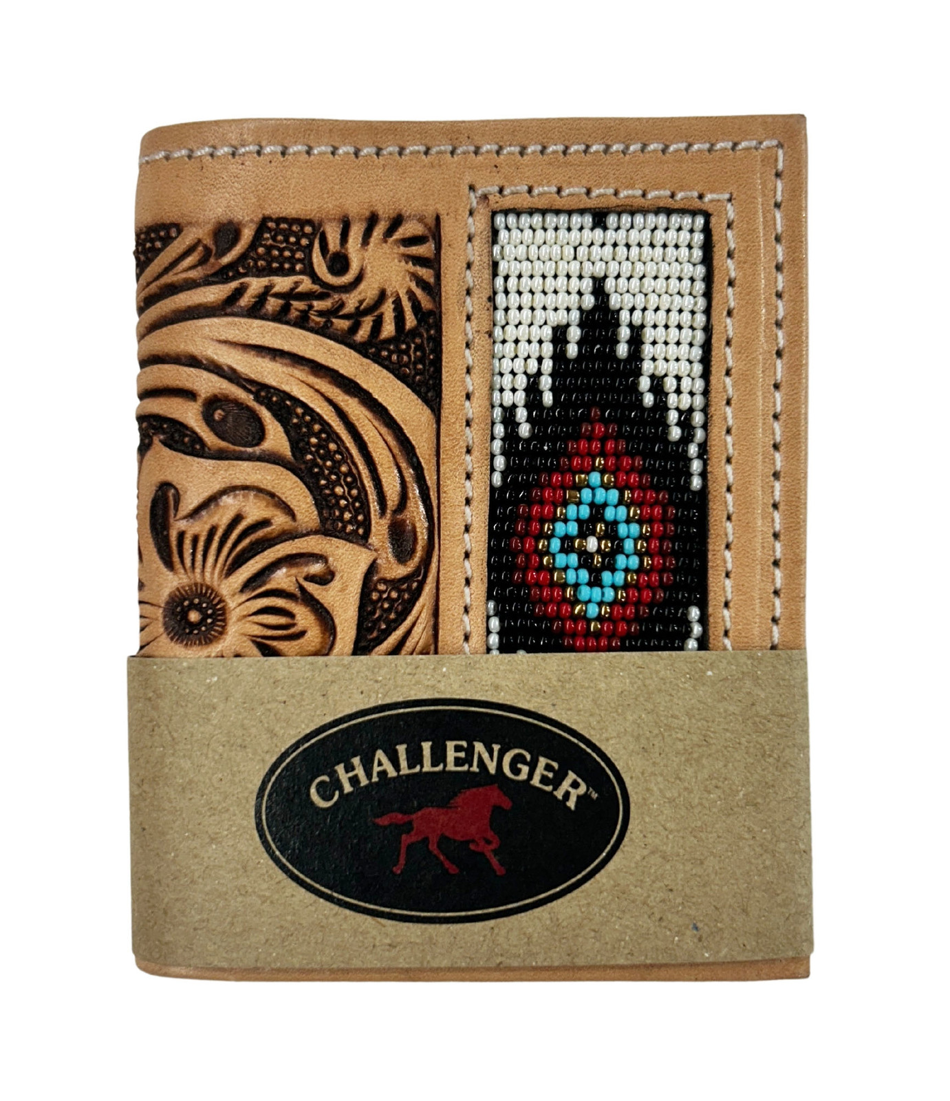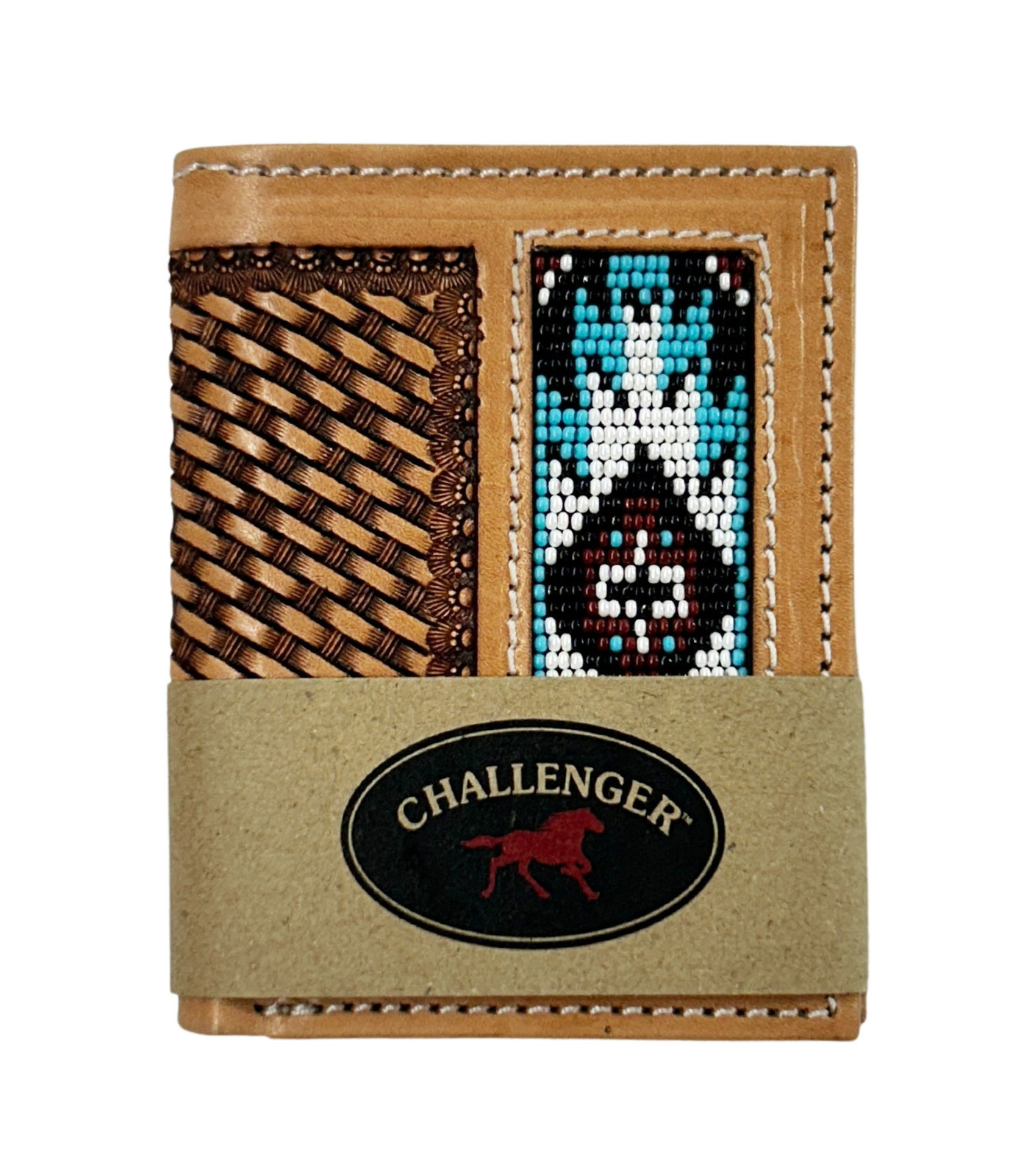 Challenger men's western bi-fold wallet made from supple genuine full-grain leather to endure everyday use. Wallet features a hand-tooled basket weave design, with a poker beaded pattern inlay. Inside has soft pebbled leather with six credit card slots, a cash compartment, and a visible window ID slot. Wallet measures 4-1/4" L x 3-1/2" W.