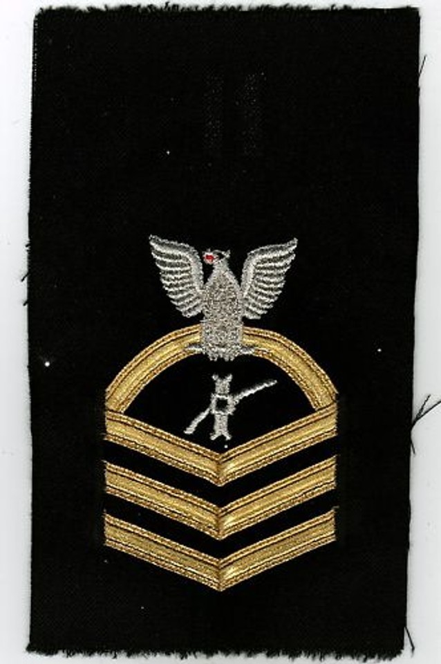 U. S. Navy female rating badge for Chief Petty Officer LMC Legalman - CPO. Gold stripes represent 12 years good conduct. Rate has not been cropped around borders which is common with alteration or uniform tailor shops which crop them before they are sewn onto the uniform. Rate is manufactured in the U. S.A. by Bende Sons, Inc of New Jersey.