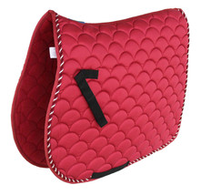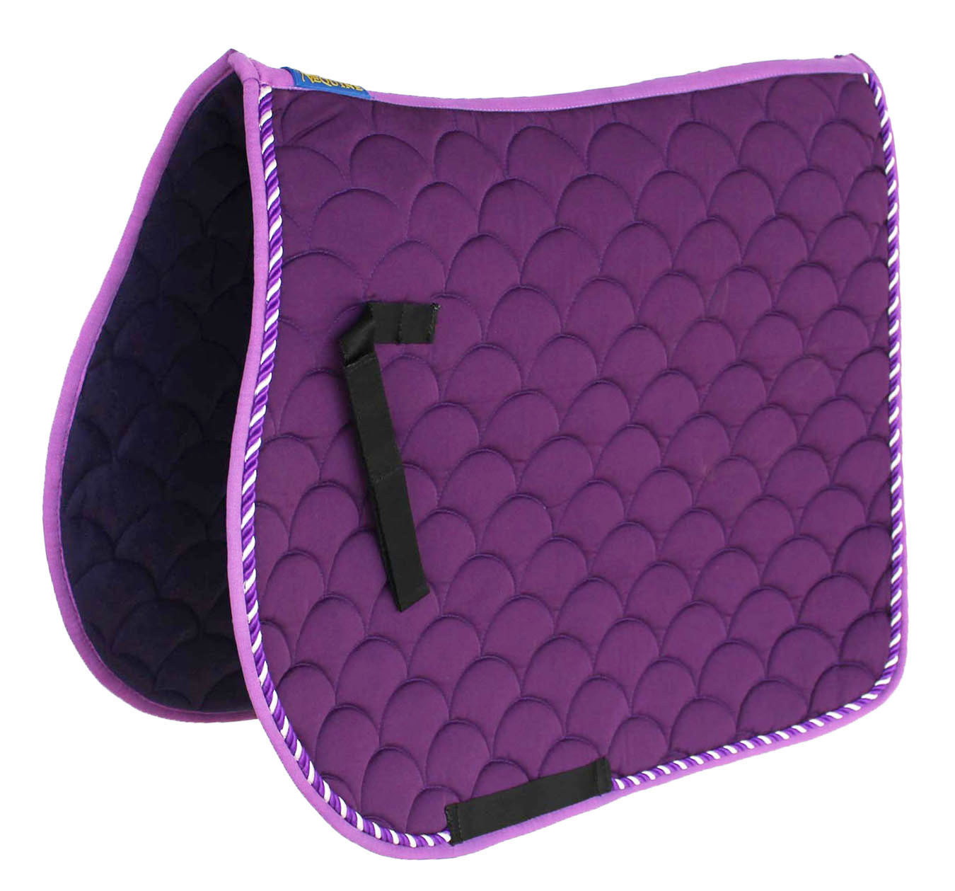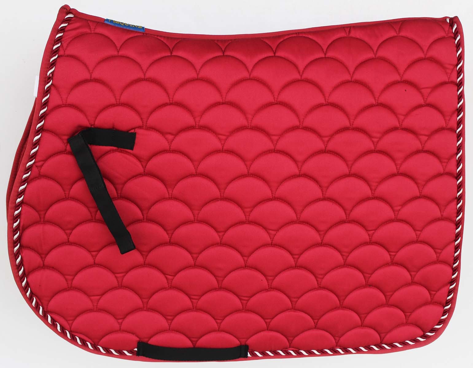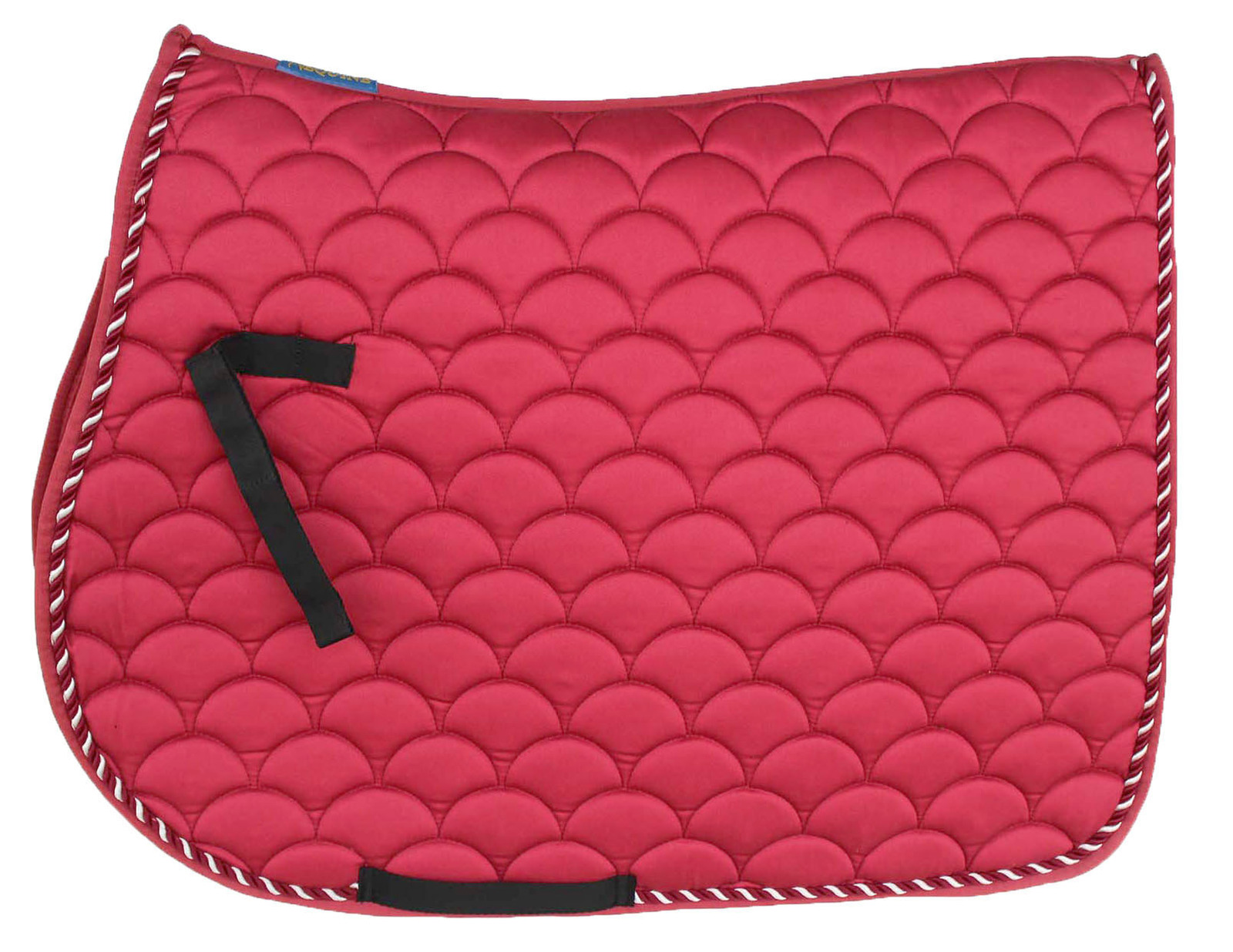 Professional Equine English Quilted All-Purpose Saddle Pad provides added comfort to both the rider and horse. Shock absorbing pad is contoured for whiter relief. Beautifully accented with rolled trims all around and a unique umbrella quilted pattern. Features nylon web girth and billet straps with Velcro for easy fastening. Measurement : 23" Spine x 20" Drop
