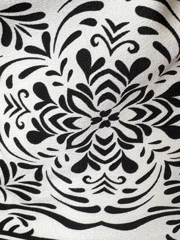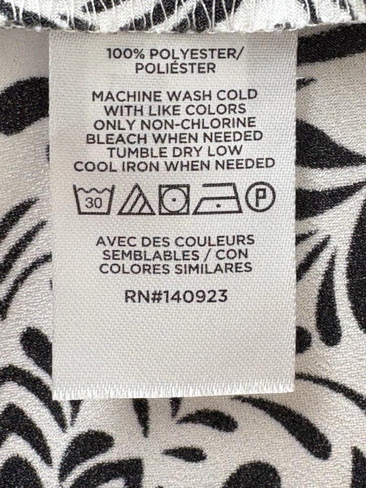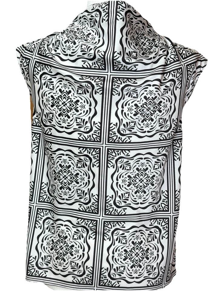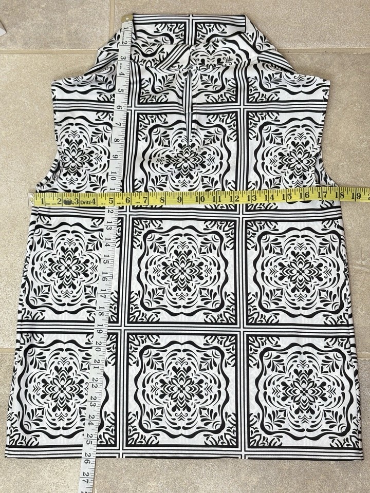 Lightweight and breathable sleeveless top featuring a bold black and white geometric floral print. Easy-care polyester fabric for everyday wear.