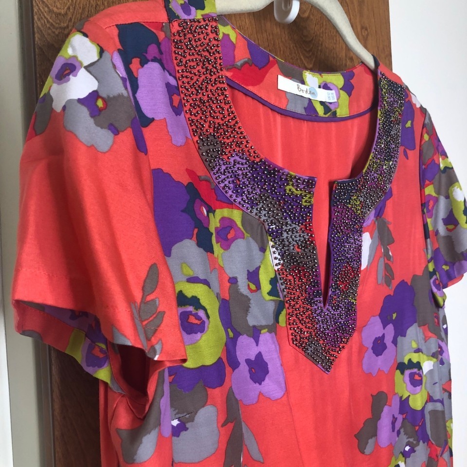 This dress pairs vibrant floral prints with intricate beadwork for a standout look. Designed for comfort and style, it suits casual or semi-formal settings. Great for work, professional, church, wedding, a cocktail party or formal restauarnt.