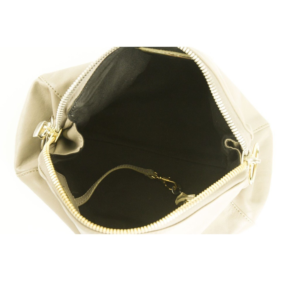 This Paule Ka clutch bag is a top quality accessory every girl will love. This beautiful and practical clutch features two rings ( silver and gold tone) / zip pull, a padlock for extra safety and one zipper protected inside pocket. The exterior soft leather in taupe color makes this lovely clutch suitable for any outfit. The interior is clean. Overall it is in excellent condition.