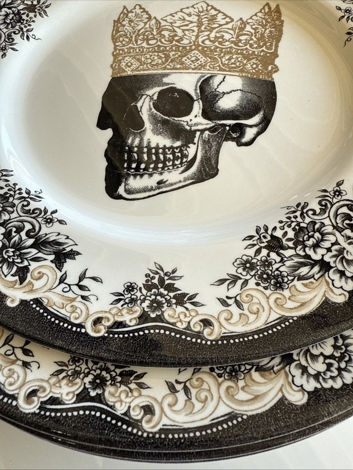 (6) Royal Stafford Halloween King Crown Skull Dinner Plates 11” ~ New ~