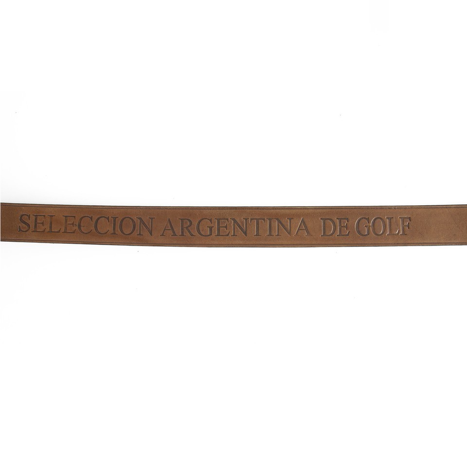 High quality brown belt from the leather luxury house of Argentina, Cardon. With brass tone buckle and the Argentinian flag, embossed lettering ( selection Argentina de golf) this belt is an added touch of luxury and style.