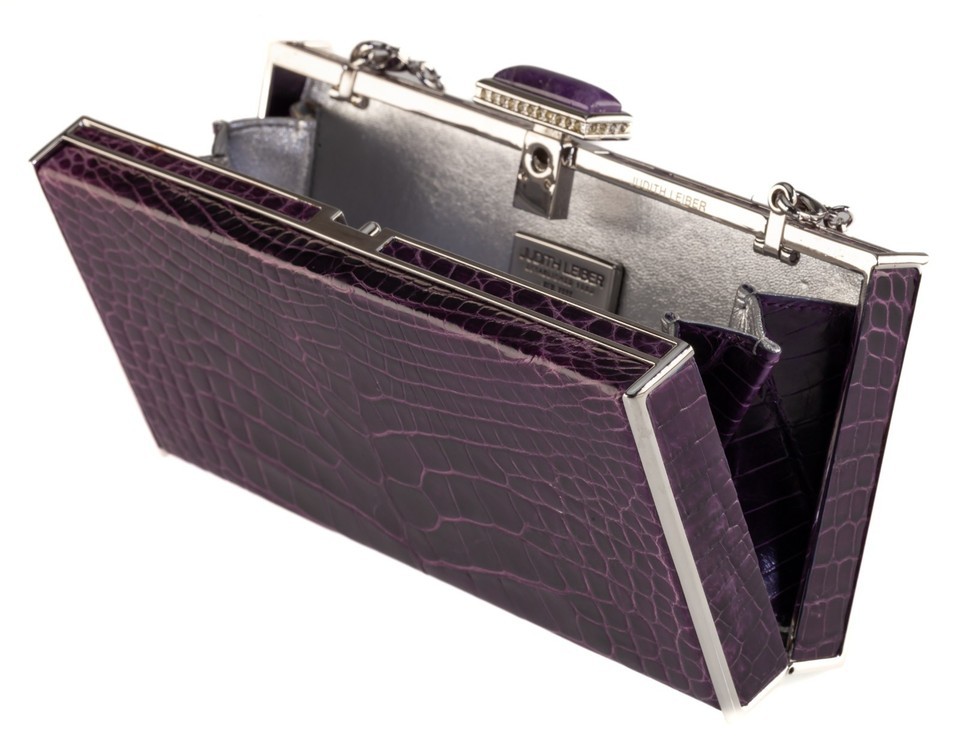 Authenticity Guarantee Judith Leiber Purple Alligator Clutch with Purple Swa...