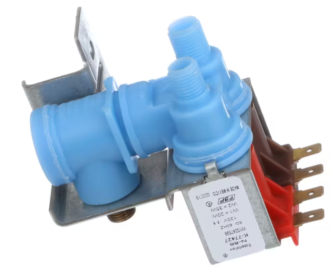 The Whirlpool K-77427, W10247599 Solenoid Valve is a genuine OEM dual coil water inlet valve designed for Whirlpool, KitchenAid, and related refrigerators. This part regulates the flow of water to both the ice maker and water dispenser, ensuring consistent operation and reliable performance. If your refrigerator is leaking, not dispensing water, or failing to make ice, replacing the solenoid valve restores proper functionality.