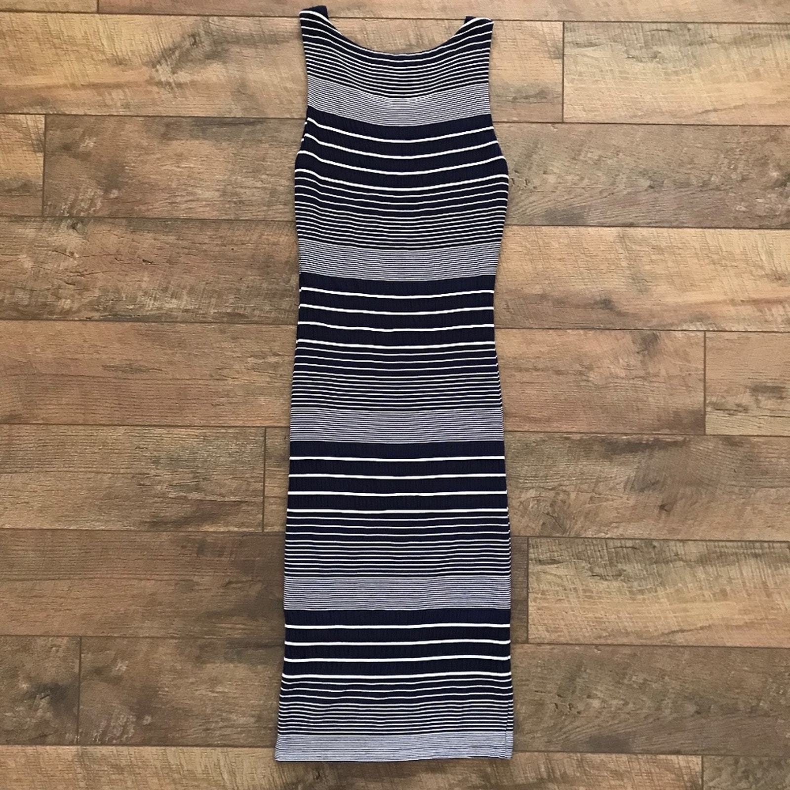 Textured column dress. Navy blue and white horizontal stripes. Pullover styling. Stretchy and comfortable. Form fitting and body contouring. Sleeveless midi dress.