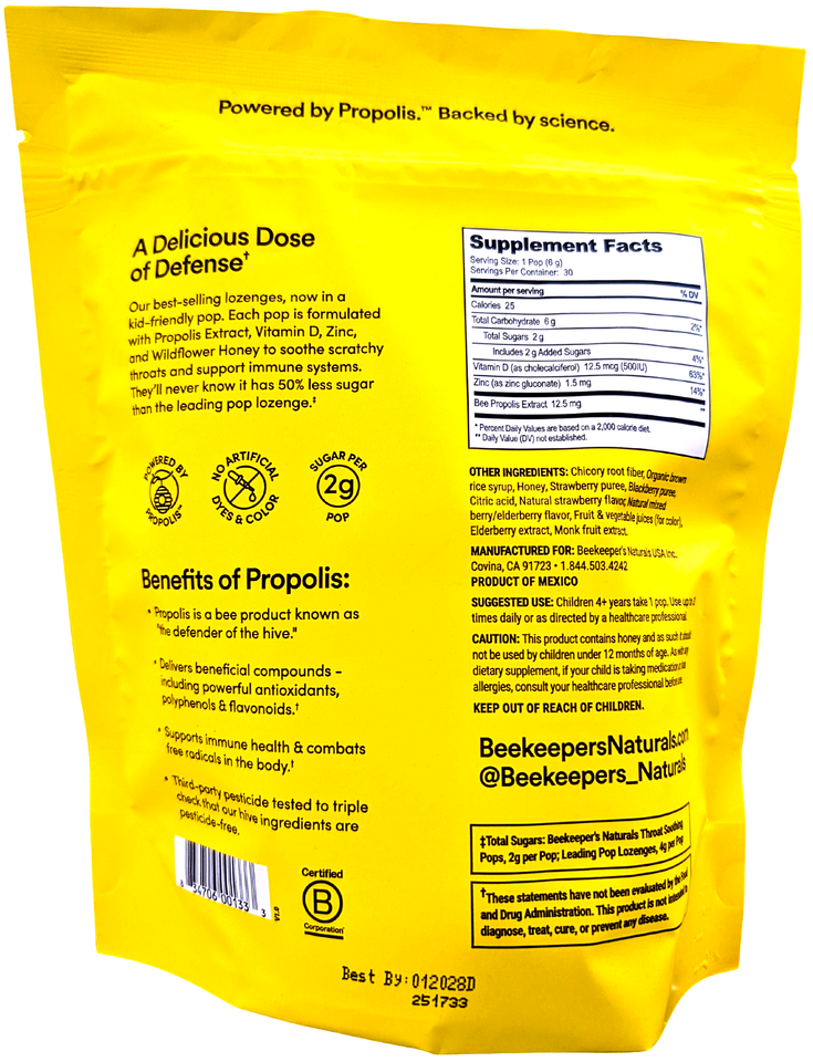 BeeKeeper's Naturals Kid's Propolis Throat Soothing Pops Strawberry 30 Ct 01/28