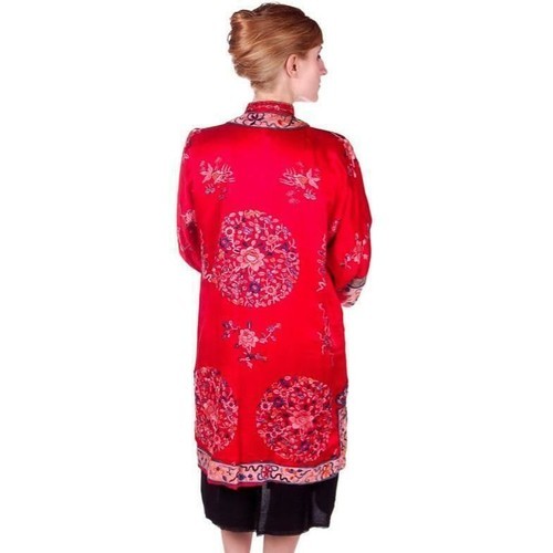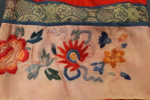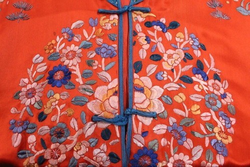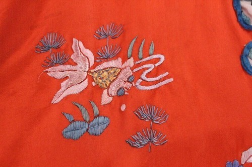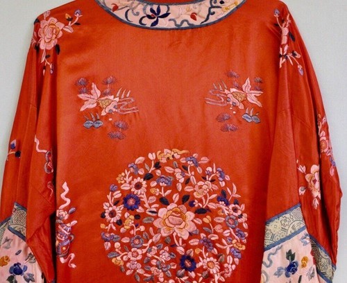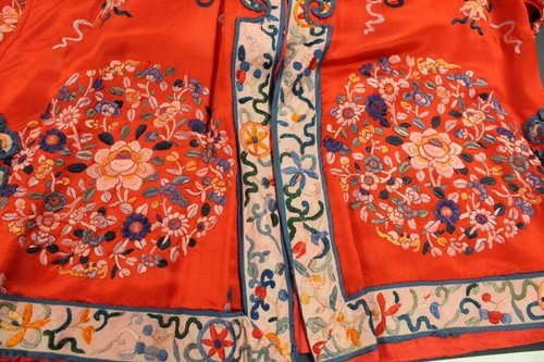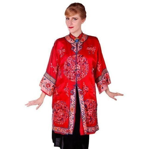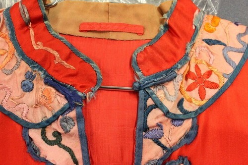 Antique Victorian Chinese Robe Coat Red Silk Embroidered Free VTG Brooch