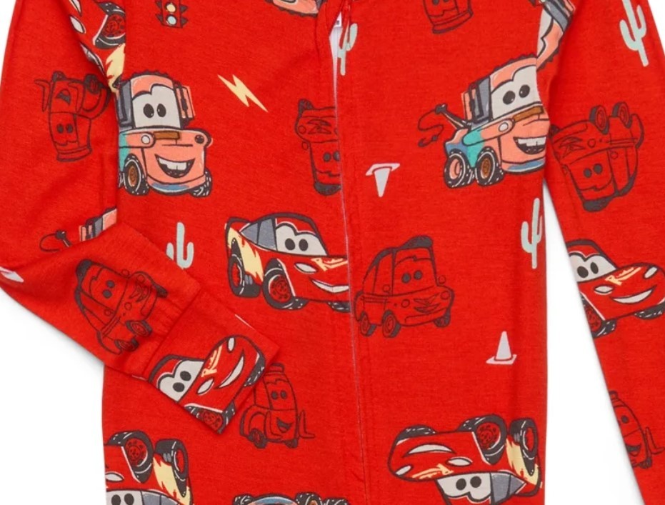 This Cars Pajama One-Piece features a cozy all-in-one design that is perfect for young fans of the Cars movies. It showcases a fun and colorful print of Lightning McQueen, Mater, and Guido against a vibrant red background. The easy, zip-front closure surrounds your toddler in a soft viscose blend for a cozy style. The sleeper has a full front zipper and footless design.
