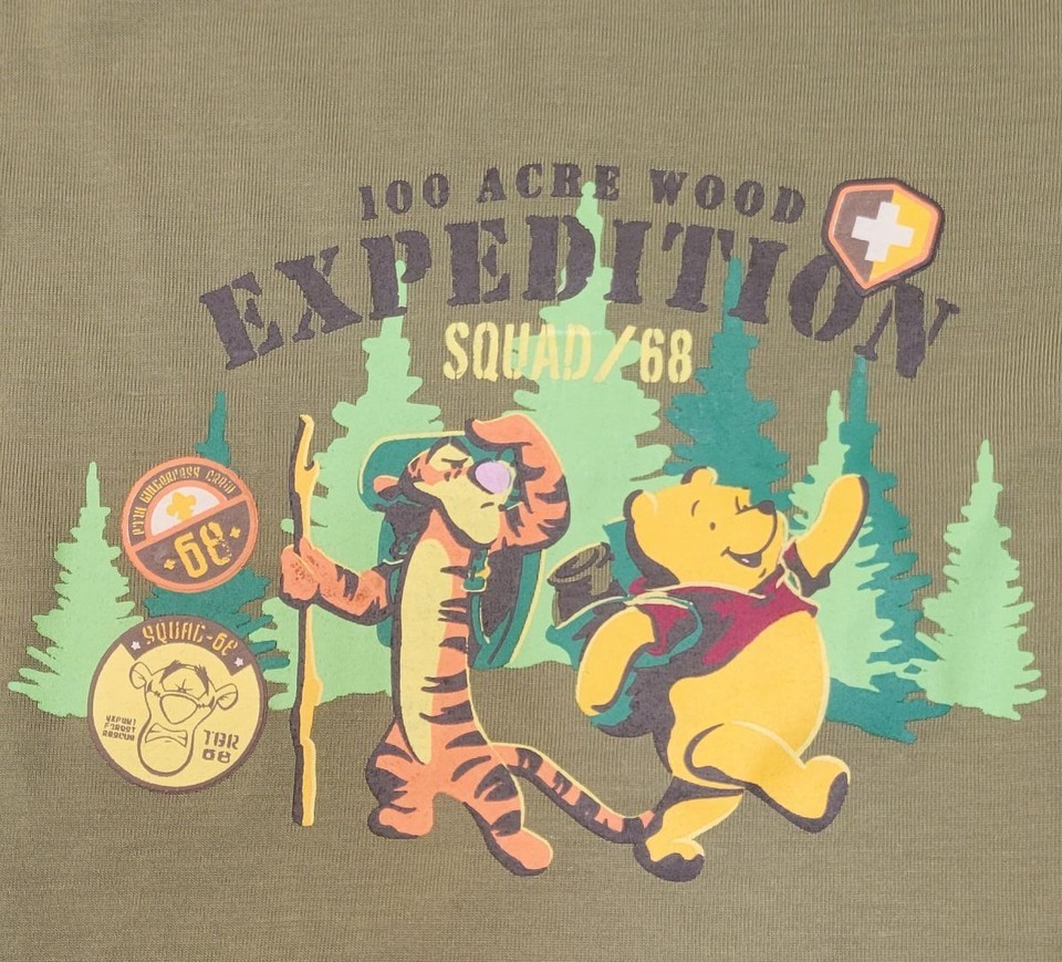 Coordinating pajama pants in camo with outlines of Tigger and Pooh throughout.