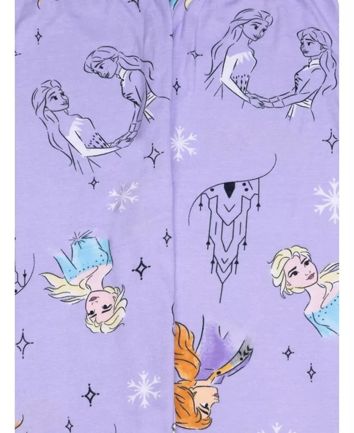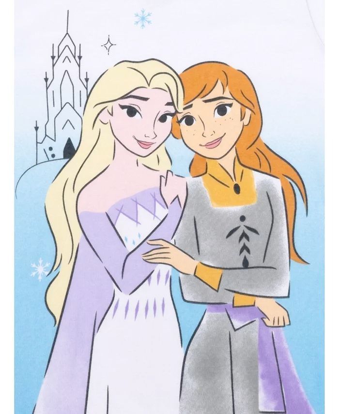 She'll love the colorful and magical graphic and print featuring sisters Anna and Elsa. Features crew neck style collars with lavender and sky blue rib-knit trim. Coordinating print pajama pants and shorts with full elasticized waistbands. Crafted of a 100% cotton, to be worn snug-fitting.