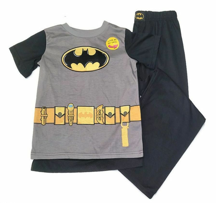 Features a costume style Batman graphic with detachable cape and coordinating pajama shorts and pants.