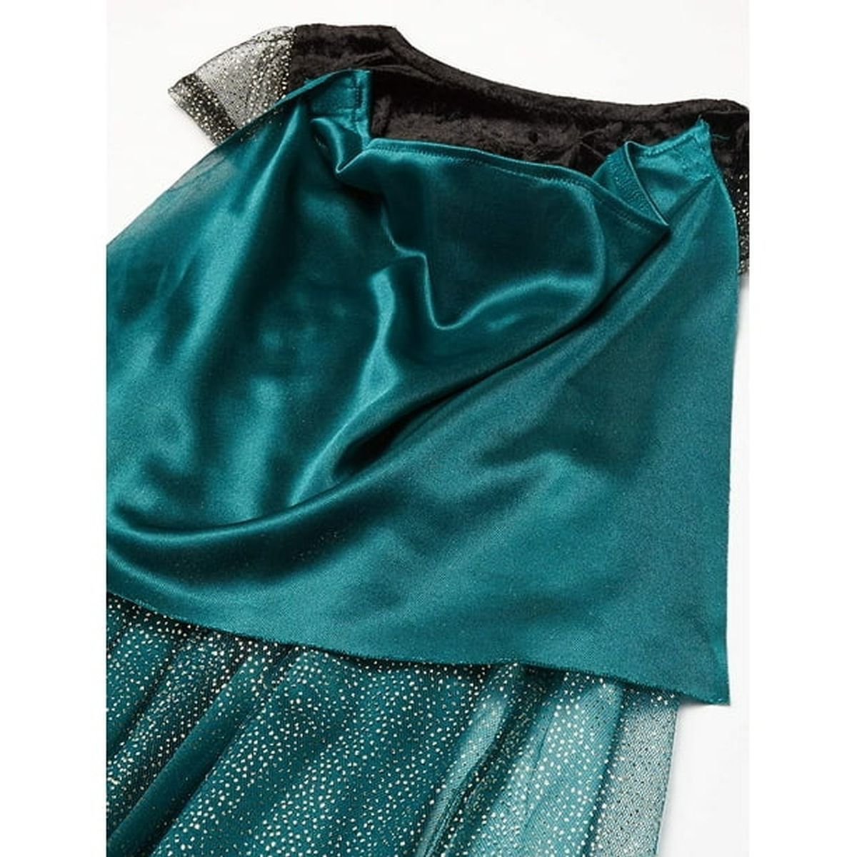 One of the standout elements of this nightgown is the detachable satin teal cape at the back, secured with Velcro tabs for easy removal. A coordinating ribbon fabric accent underneath the bodice enhances the overall design, adding a delicate touch.
