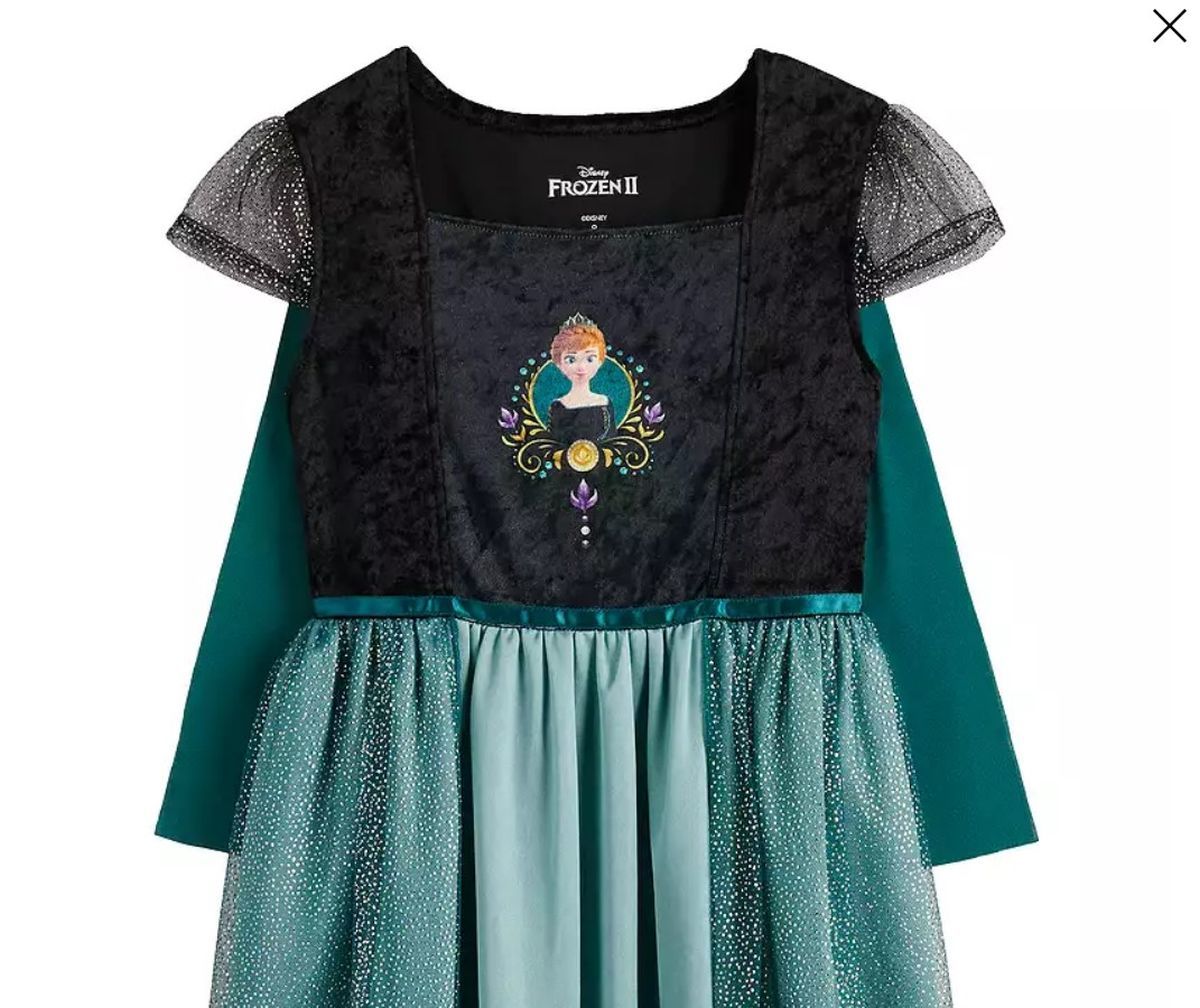 This stunning nightgown is designed to make any young girl feel as elegant and regal as a Disney Queen or Princess. It features a vibrant illustration of Anna in a charming scroll cameo, set against a luxurious black velvety velour bodice that adds a touch of sophistication.